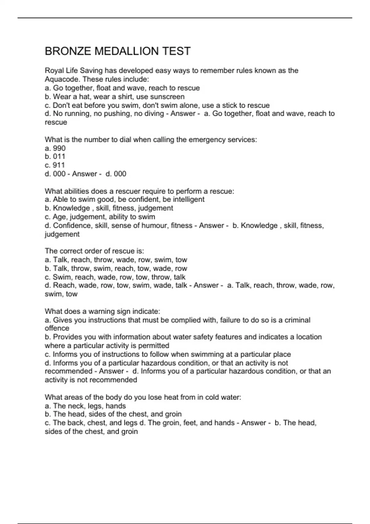 Royal Life Saving has developed easy ways to remember rules known as the Aquacode. These rules include: a. Go together, float and wave, reach to rescue b. Wear a hat, wear a shirt, use sunscreen c. Don't eat before you swim, don't swim alone, use a stick to rescue d. No running, no pushing, no diving - Answer - a. Go together, float and wave, reach to rescue What is the number to dial when calling the emergency services: a. 990 b. 011 c. 911 d. 000 - Answer - d. 000 What abilities does a rescuer require to perform a rescue: a. Able to swim good, be confident, be intelligent b. Knowledge , skill, fitness, judgement c. Age, judgement, ability to swim d. Confidence, skill, sense of humour, fitness - Answer - b. Knowledge , skill, fitness, judgement The correct order of rescue is: a. Talk, reach, throw, wade, row, swim, tow b. Talk, throw, swim, reach, tow, wade, row c. Swim, reach, wade, row, tow, throw, talk d. Reach, wade, row, tow, swim, wade, talk - Answer - a. Talk, reach, throw, wade, row, swim, tow What does a warning sign indicate: a. Gives you instructions that must be complied with, failure to do so is a criminal offence b. Provides you with information about water safety features and indicates a location where a particular activity is permitted c. Informs you of instructions to follow when swimming at a particular place d. Informs you of a particular hazardous condition, or that an activity is not recommended - Answer - d. Informs you of a particular hazardous condition, or that an activity is not recommended What areas of the body do you lose heat from in cold water: a. The neck, legs, hands b. The head, sides of the chest, and groin c. The back, chest, and legs d. The groin, feet, and hands - Answer - b. The head, sides of the chest, and groin
