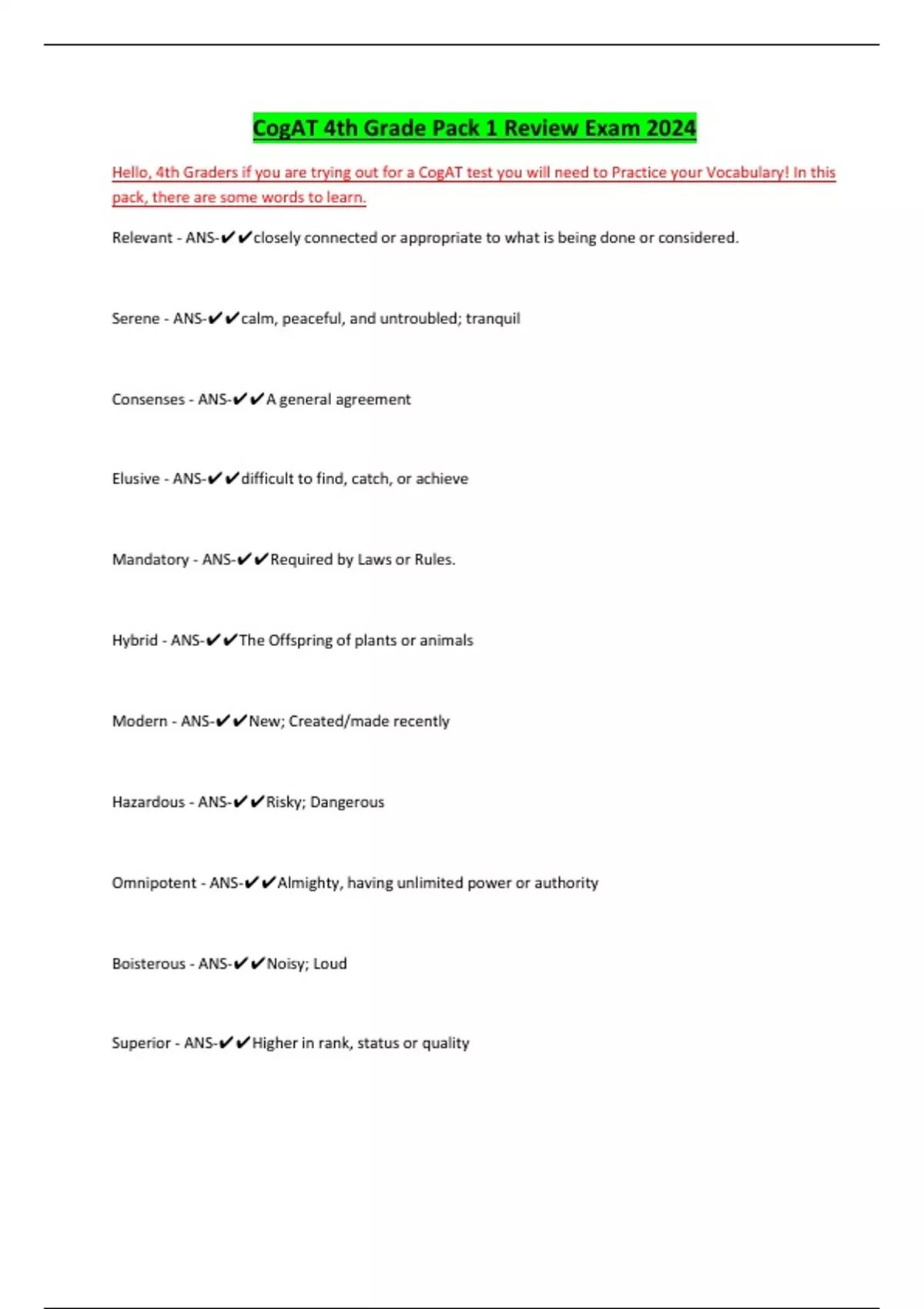 CogAT 4th Grade Pack 1 Review Exam 2024 Hello, 4th Graders if you are trying out for a CogAT test you will need to Practice your Vocabulary! In this pack, there are some words to learn. Relevant - ANS-closely connected or appropriate to what is being done or considered. Serene - ANS-calm, peaceful, and untroubled; tranquil Consenses - ANS-A general agreement Elusive - ANS-difficult to find, catch, or achieve Mandatory - ANS