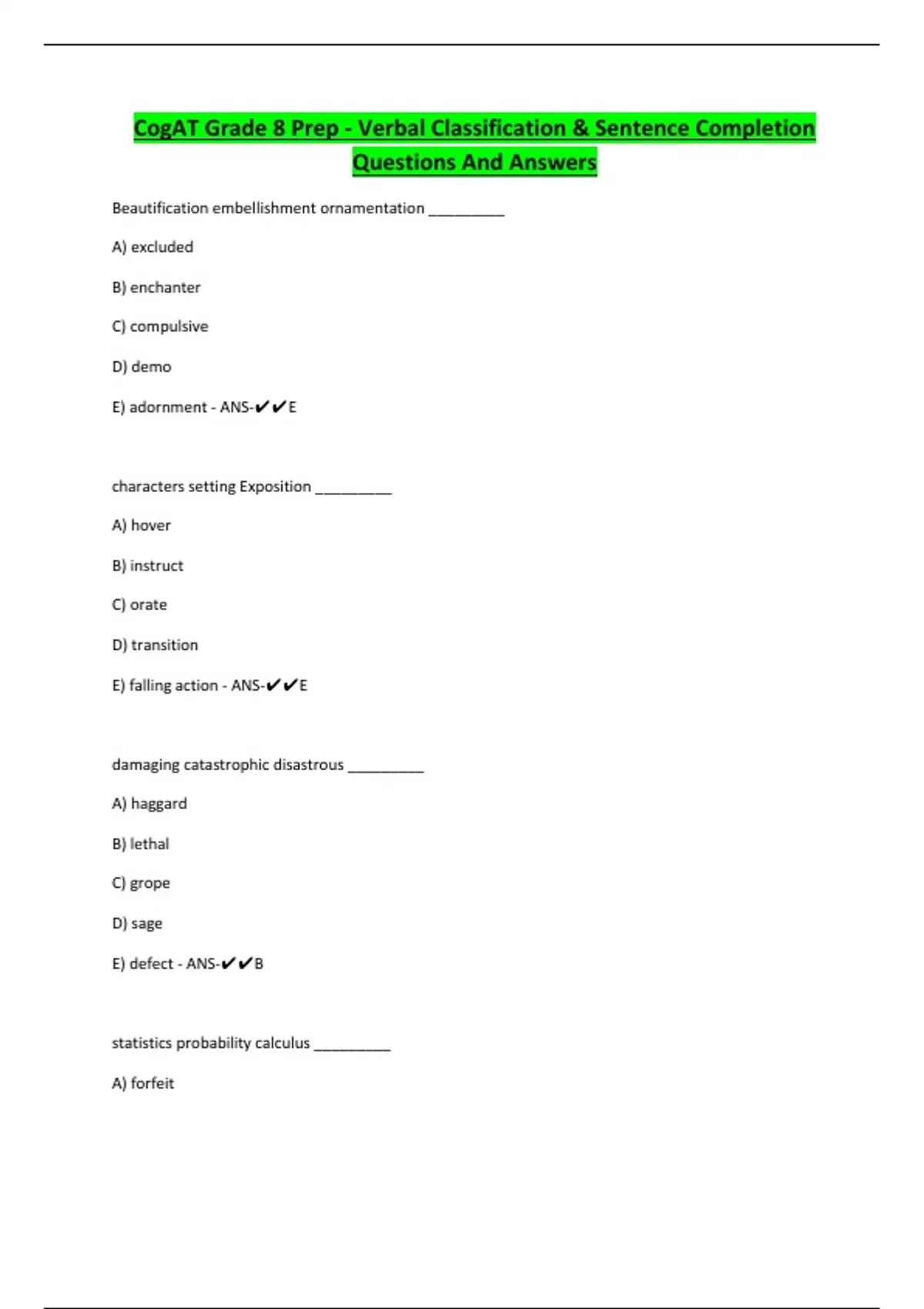 CogAT Grade 8 Prep - Verbal Classification & Sentence Completion Questions And Answers Beautification embellishment ornamentation _________ A) excluded B) enchanter C) compulsive D) demo E) adornment - ANS-E characters setting Exposition _________ A) hover B) instruct C) orate D) transition E) falling action - ANS-E damaging catastrophic disastrous _________ A) haggard B) lethal C) grope D) sage E) defect - ANS-