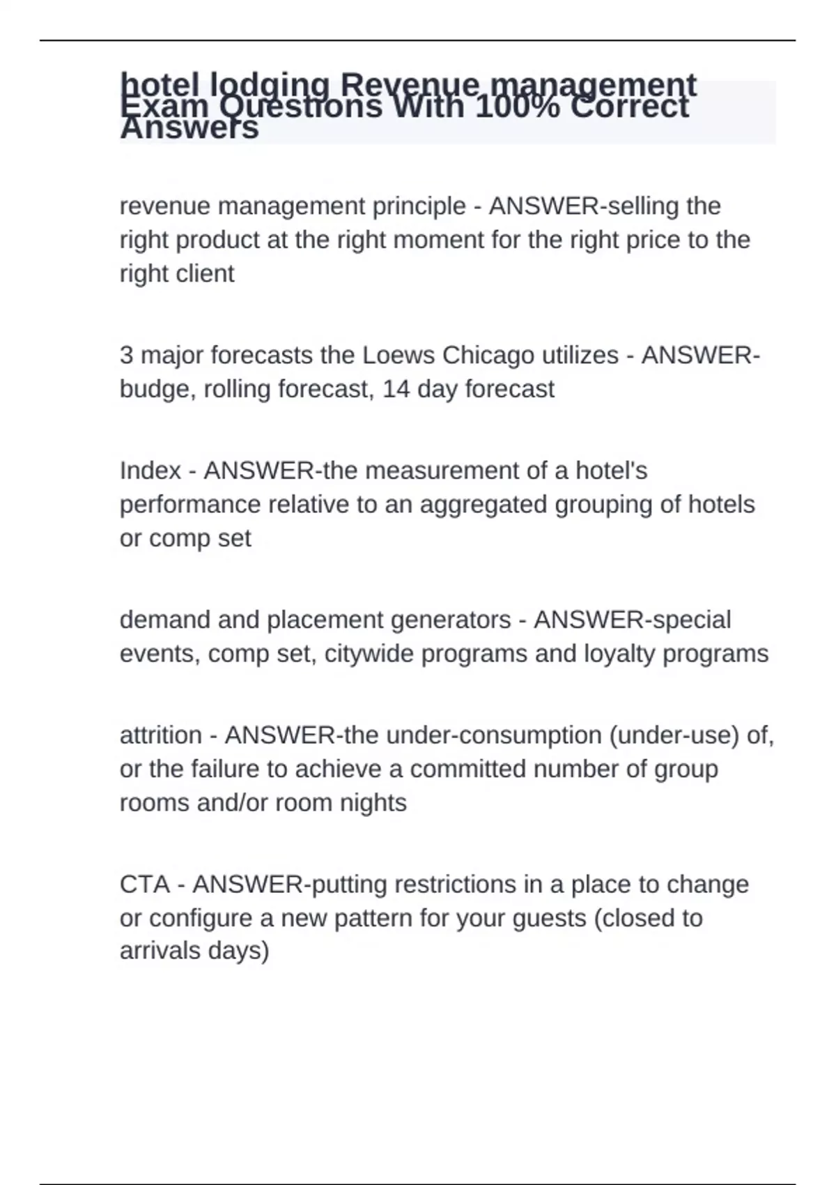 revenue management principle - ANSWER-selling the right product at the right moment for the right price to the right client 3 major forecasts the Loews Chicago utilizes - ANSWER-budge, rolling forecast, 14 day forecast Index - ANSWER-the measurement of a hotel's performance relative to an aggregated grouping of hotels or comp set demand and placement generators - ANSWER-special events, comp set, citywide programs and loyalty programs attrition - ANSWER-the under-consumption (under-use) of, or the failure to achieve a committed number of group rooms and/or room nights