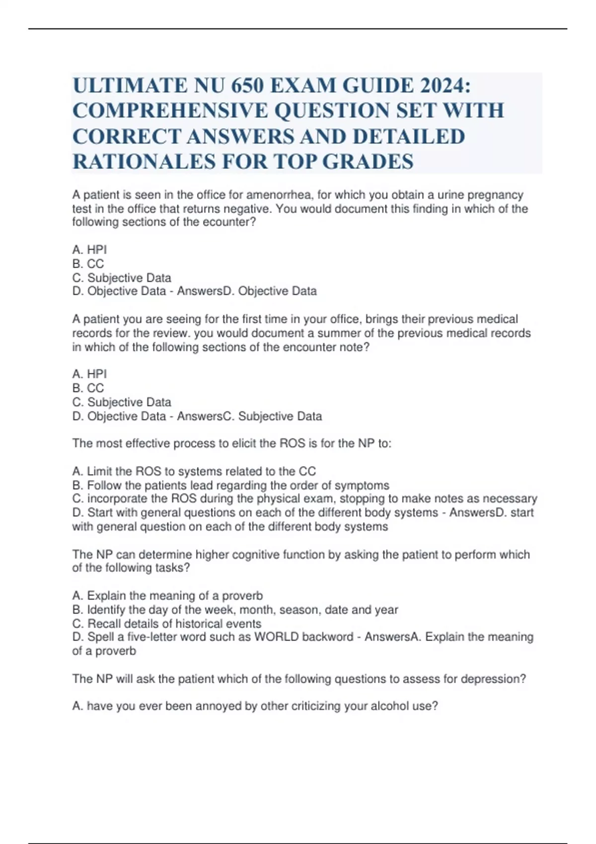 ULTIMATE NU 650 EXAM GUIDE 2024: COMPREHENSIVE QUESTION SET WITH CORRECT ANSWERS AND DETAILED RATIONALES FOR TOP GRAD ES A patient is seen in the office for amenorrhea, for which you obtain a urine pregnancy test in the office that returns negative. You would document this finding in which of the following sections of the ecounter? A. HPI B. CC C. Subjective Data D. Objective Data - AnswersD. Objective Data A patient you are seeing for the first time in your office, brings their previous medical records for the review. you would document a summer of the previous medical records in which of the following sections of the encounter note? A. HPI B. CC C. Subjective Data D. Objective Data - AnswersC. Subjective Data The most effective process to elicit the ROS is for the NP to: A. Limit the ROS to systems related to the CC B. Follow the patients lead regarding the order of symptoms C. incorporate the ROS during the physical exam, stopping to make notes as necessary D. Start with general questions on each of the different body systems - AnswersD. start with general question on each of the different body systems The NP can determine higher cognitive function by asking the patient to perform which of the following tasks? A. Explain the meaning of a proverb B. Identify the day of the week, month, season, date and year C. Recall details of historical events D. Spell a five -letter word such as WORLD backword - AnswersA. Explain the meaning of a proverb The NP will ask the patient which of the following questions to assess for depression? A. have you ever been annoyed by other criticizing your alcohol use? B. Over the past two weeks have you felt little interest or pleasure in doing things? C. Over the past two weeks have you been unable to stop or control worrying? D. How often do you have contact with those that you care about or care about you? - AnswersB. Over the past two weeks have you felt little interest or pleasure in doing things? The NP will document the reason for visit in which of the following sections of the encounter? A. HPI B. CC C. Subjective Data D. Objective Data - AnswersB. CC The primary care provider will anticipate that what percent of outpatients have mental health disorders? A. 10% B. 15 % C. 20% d. 25% - Answersc. 20% Which of the following actions by the NP demonstrations patient -centered interviewing techniques? A. Determine the personal context of the patients symptoms B. Focus on symptoms to identify a disease or condition C. Offer his or her perspective to lead the patients response D. Solicit information from the patients significant others - AnswersA. A. Determine the personal context of the patients symptoms Which of the following strategies is most effective when dealing with an angry or disruptive patient? A. Allow the patient to disrupt the setting as needed to alleviate their anger B. Ask the patient to lower their voice and remain calm throughout the interview C. Reinforce the patients criticisms of other clinicians or the facility D. Validate the patients feelings without agreeing with their reasons. - AnswersD. Validate the patients feelings without agreeing with their reasons. Which of the following variables should have the greatest affect as to how the NP will conduct the H & PE of a child? A. The child's developmental level B. the child's chronological age C. The expected head to toe format and order of examination techniques