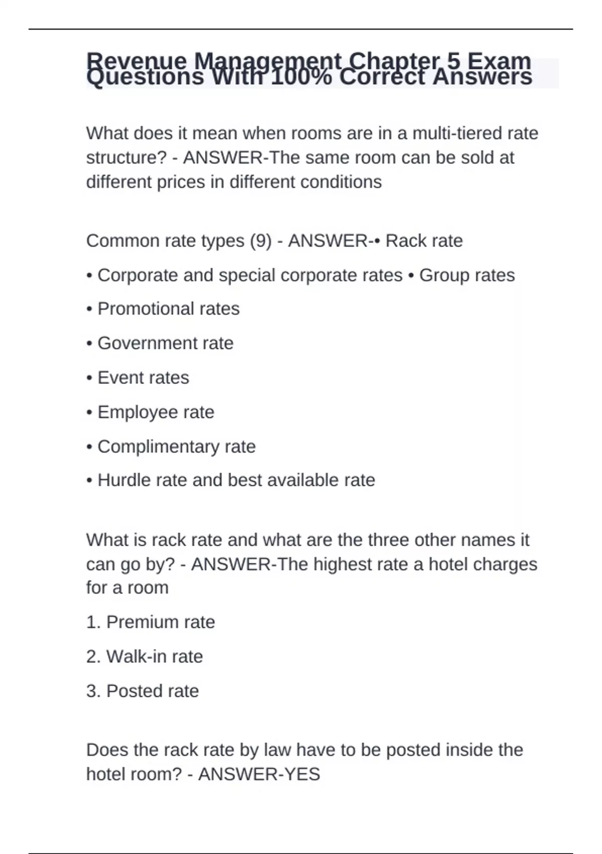 What does it mean when rooms are in a multi-tiered rate structure? - ANSWER-The same room can be sold at different prices in different conditions Common rate types (9) - ANSWER-• Rack rate • Corporate and special corporate rates • Group rates • Promotional rates • Government rate • Event rates • Employee rate • Complimentary rate • Hurdle rate and best available rate What is rack rate and what are the three other names it can go by? - ANSWER-The highest rate a hotel charges for a room 1. Premium rate 2. Walk-in rate 3. Posted rate Does the rack rate by law have to be posted inside the hotel room? - ANSWER-YES