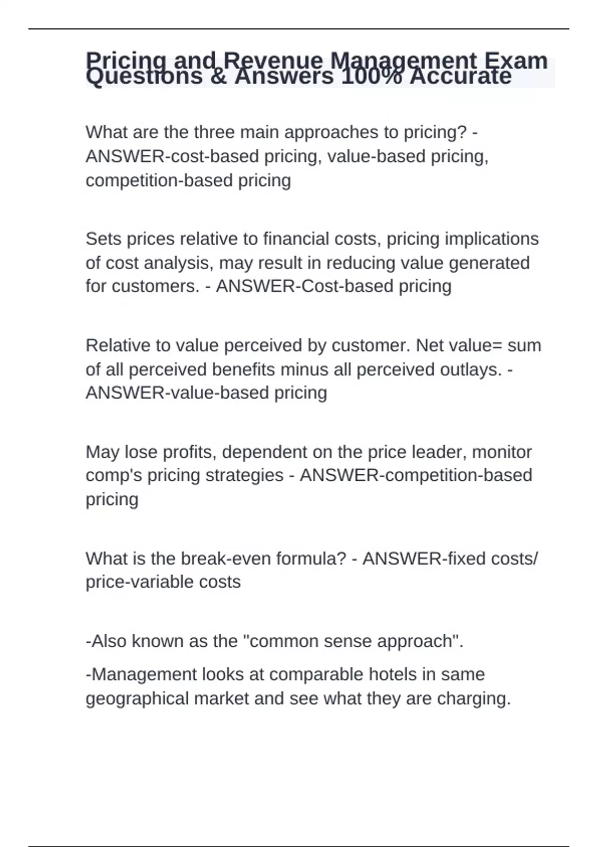 What are the three main approaches to pricing? - ANSWER-cost-based pricing, value-based pricing, competition-based pricing Sets prices relative to financial costs, pricing implications of cost analysis, may result in reducing value generated for customers. - ANSWER-Cost-based pricing Relative to value perceived by customer. Net value= sum of all perceived benefits minus all perceived outlays. - ANSWER-value-based pricing May lose profits, dependent on the price leader, monitor comp's pricing strategies - ANSWER-competition-based pricing What is the break-even formula? - ANSWER-fixed costs/ price-variable costs -Also known as the "common sense approach".