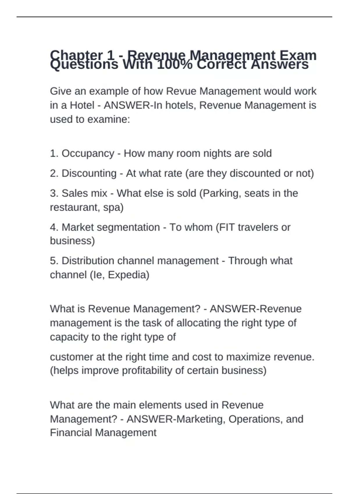 Chapter 1 - Revenue Management Exam Questions With 100% Correct Answers