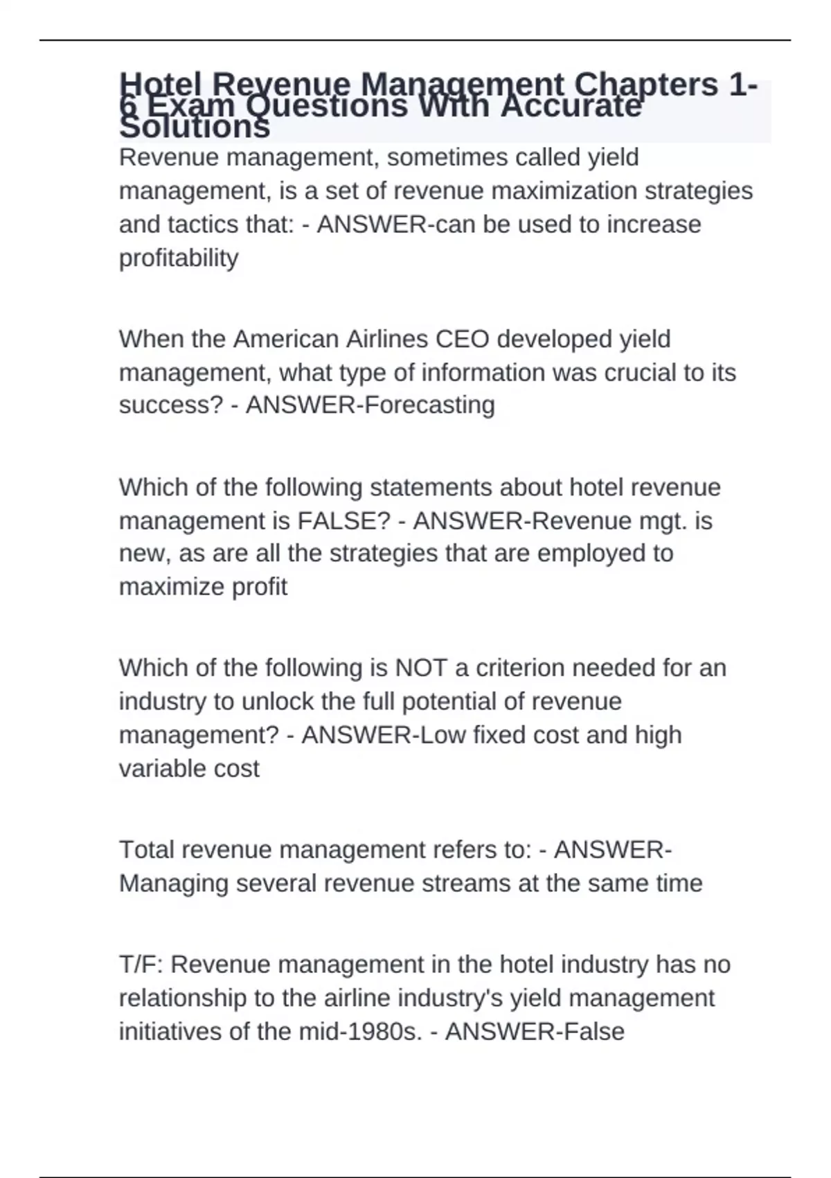 Hotel Revenue Management Chapters 1-6 Exam Questions With Accurate Solutions