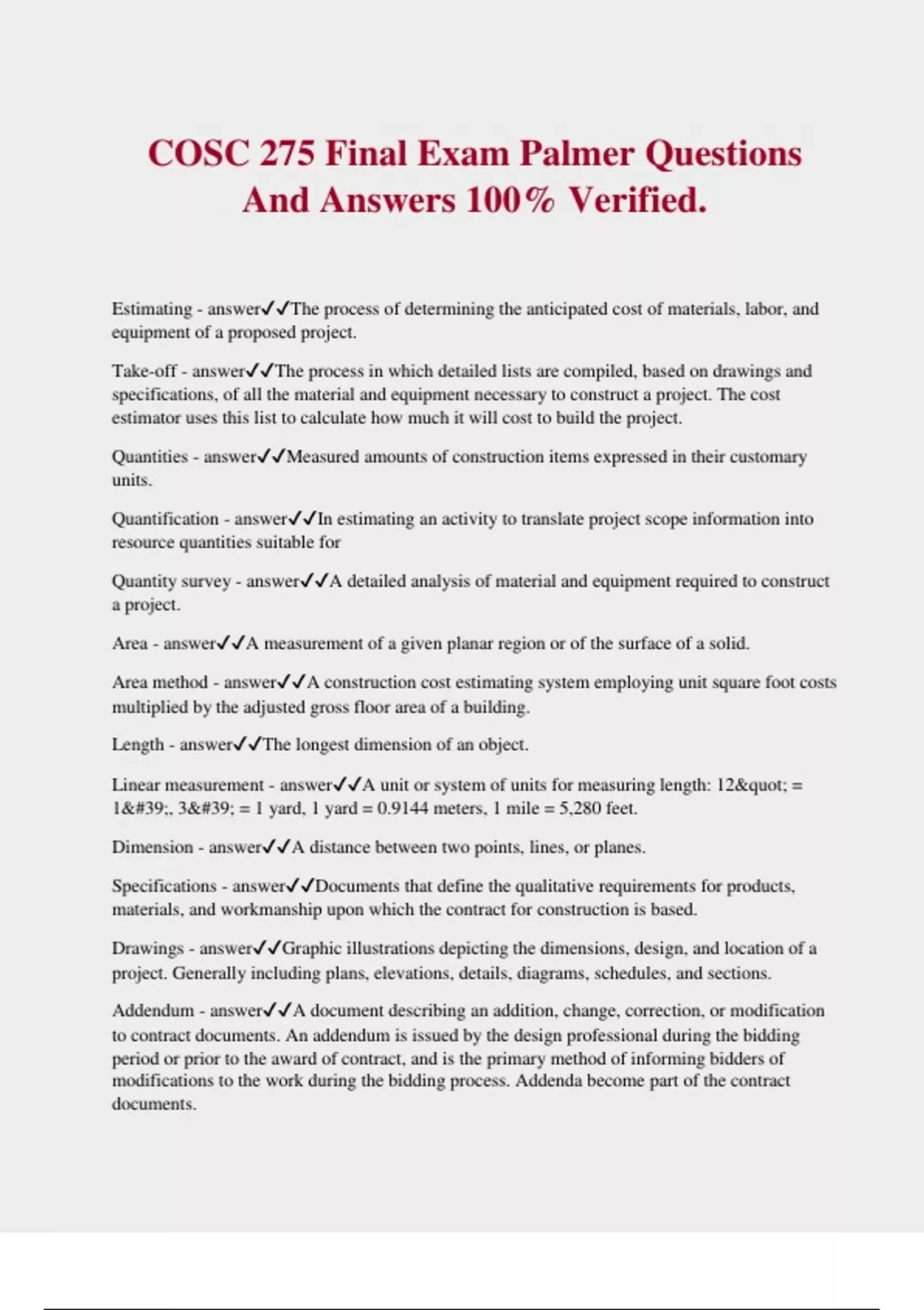 COSC 275 Final Exam Palmer Questions And Answers 100% Verified. Estimating - answerThe process of determining the anticipated cost of materials, labor, and equipment of a proposed project. Take-off - answerThe process in which detailed lists are compiled, based on drawings and specifications, of all the material and equipment necessary to construct a project. The cost estimator uses this list to calculate how much it will cost to build the project. Quantities - answerMeasured amounts of construction items expressed in their customary units. Quantification - answerIn estimating an activity to translate project scope information into resource quantities suitable for Quantity survey - answerA detailed analysis of material and equipment required to construct a project. Area - answerA measurement of a given planar region or of the surface of a solid. Area method - answerA construction cost estimating system employing unit square foot costs multiplied by the adjusted gross floor area of a building. Length - answerThe longest dimension of an object. Linear measurement - answerA unit or system of units for measuring length: 12" = 1', 3' = 1 yard, 1 yard = 0.9144 meters, 1 mile = 5,280 feet. Dimension - answerA distance between two points, lines, or planes. Specifications - answerDocuments that define the qualitative requirements for products, materials, and workmanship upon which the contract for construction is based. Drawings - answerGraphic illustrations depicting the dimensions, design, and location of a project. Generally including plans, elevations, details, diagrams, schedules, and sections. Addendum - answerA document describing an addition, change, correction, or modification to contract documents. An addendum is issued by the design professional during the bidding period or prior to the award of contract, and is the primary method of informing bidders of modifications to the work during the bidding process. Addenda become part of the contract documents. Amendment - answerA modification of the contract by a subsequent agreement. This does not change the entire existing contract but does alter the terms of the affected provisions or requirements. Grade - answerThe surface or level of the ground. Level - answerA term used to describe any horizontal surface that has all points at the same elevation and thus does not tilt or slope. Site - answerThe location of a project geographically, usually defined by legal boundaries. Elevation - answerA vertical distance relative to a reference point. Cut and fill - answerAn operation commonly used in road building and other rock and earth- moving operations in which the material excavated and removed from one location is used as fill material at another location. Fill - answerThe soil or other material used to raise the grade of a site area. Foundation - answerThe entire masonry substructure below the first floor or frame of a building, including the footing upon which the building rests. Grade beam - answerA horizontal end-supported (as opposed to ground-supported) load- bearing foundation member that supports an exterior wall of a superstructure. Width - answerThe measurement or extent of something from side to side. Footing - answerThat portion of the foundation of a structure that spreads and transmits the load directly to the soil. Reinforced concrete - answerConcrete containing adequate reinforcement, prestressed or not prestressed, and designed on the assumption that the two materials (steel and concrete) act together in resisting forces. Reinforcing bar - answerA steel bar, usually with manufactured deformations, used in concrete and masonry construction to provide additional strength. Footing beam - answerA reinforced concrete beam connecting pile caps or spread footings to distribute horizontal loads caused by eccentric loading. Bolster - answerIn concrete, an individual or continuous support used to hold reinforcing bars in position. Usually used in slab work. Pan construction - answerA type of concrete floor or roof in which pan forms are used to create intersecting ribs and resulting in a waffle-like undersurface.