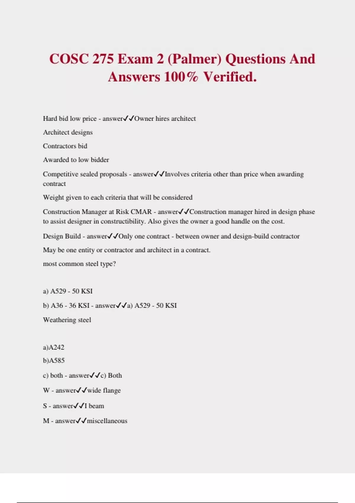 COSC 275 Exam 2 (Palmer) Questions And Answers 100% Verified. Hard bid low price - answerOwner hires architect Architect designs Contractors bid Awarded to low bidder Competitive sealed proposals - answerInvolves criteria other than price when awarding contract Weight given to each criteria that will be considered Construction Manager at Risk CMAR - answerConstruction manager hired in design phase to assist designer in constructibility. Also gives the owner a good handle on the cost. Design Build - answerOnly one contract - between owner and design-build contractor May be one entity or contractor and architect in a contract. most common steel type? a) A529 - 50 KSI b) A36 - 36 KSI - answera) A529 - 50 KSI Weathering steel a)A242 b)A585 c) both - answerc) Both W - answerwide flange S - answerI beam M - answermiscellaneous