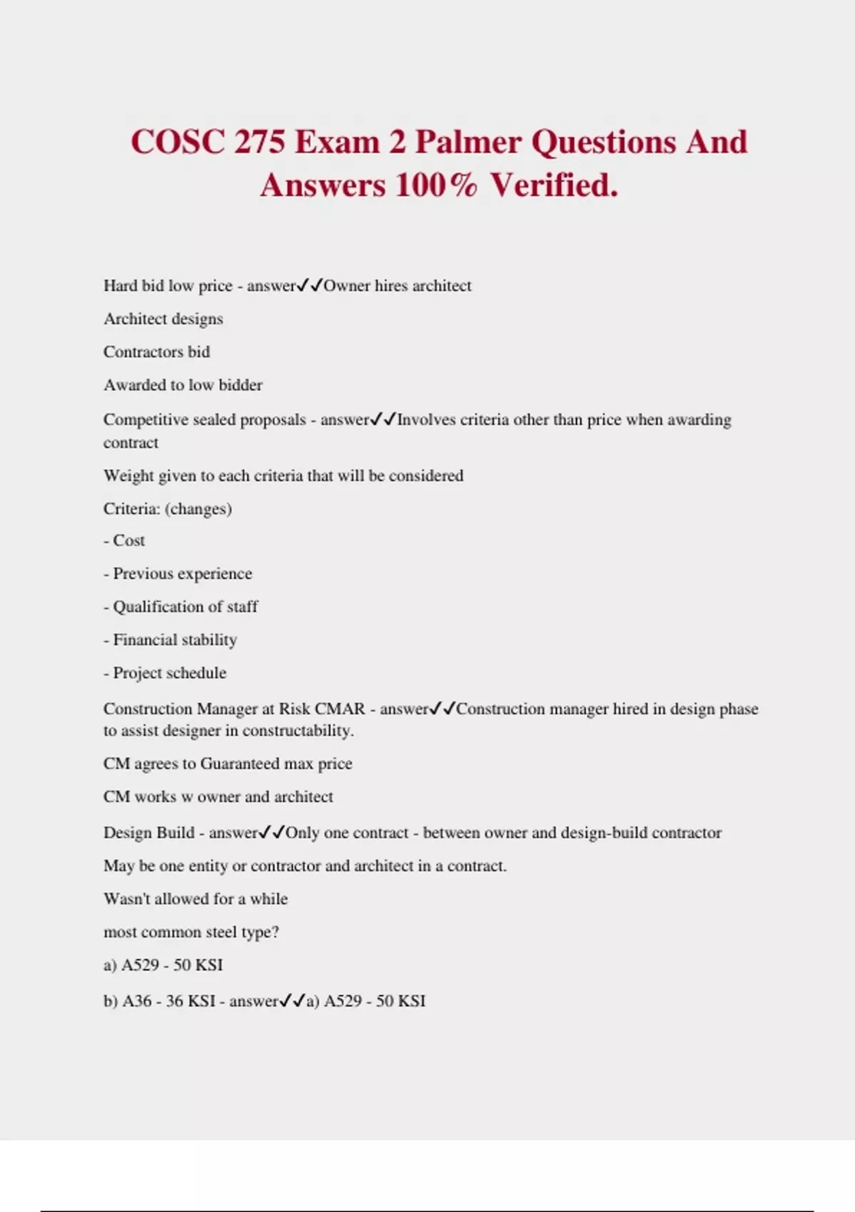 COSC 275 Exam 2 Palmer Questions And Answers 100% Verified. Hard bid low price - answerOwner hires architect Architect designs Contractors bid Awarded to low bidder Competitive sealed proposals - answerInvolves criteria other than price when awarding contract Weight given to each criteria that will be considered Criteria: (changes) - Cost - Previous experience - Qualification of staff - Financial stability - Project schedule Construction Manager at Risk CMAR - answerConstruction manager hired in design phase to assist designer in constructability. CM agrees to Guaranteed max price CM works w owner and architect Design Build - answerOnly one contract - between owner and design-build contractor May be one entity or contractor and architect in a contract. Wasn't allowed for a while most common steel type? a) A529 - 50 KSI b) A36 - 36 KSI - answera) A529 - 50 KSI Weathering steel a)A242 b)A585 c) both - answerc) Both Flag weld symbol meaning - answerField weld (on site) 4 types of envelope construction - answerTilt Wall Stud with veneer Masonry Glass Air/Vapor Barrier is always installed on ___ of wall. - answerInside Roof types - answerBuilt up roofs Single member roofs Metal roofs EPDM Cost Division Self perform groups (5) and %'s - answerTrade Contractors= 70% Self-perform= 15% Taxes= 3% General Conditions= 7% Fees= 5% Cost Division Non-Self Perform groups (4) and %'s - answerTrade contract= 85% Taxes and Bonds= 3% General Conditions= 7% Fees= 5% Buyout - answermoney that is left over when general contractor's estimate is above subcontractor's final price