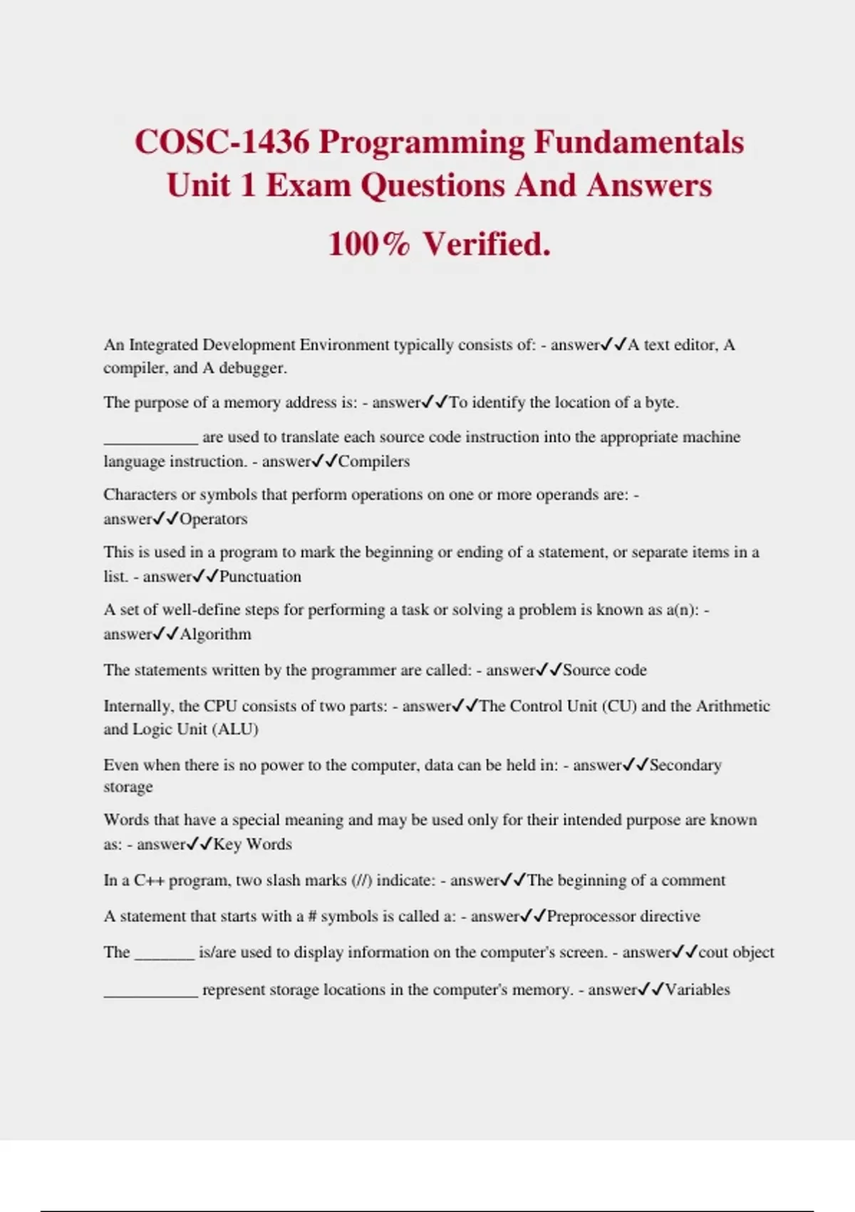 COSC-1436 Programming Fundamentals Unit 1 Exam Questions And Answers 100% Verified. An Integrated Development Environment typically consists of: - answerA text editor, A compiler, and A debugger. The purpose of a memory address is: - answerTo identify the location of a byte. ___________ are used to translate each source code instruction into the appropriate machine language instruction. - answerCompilers Characters or symbols that perform operations on one or more operands are: - answerOperators This is used in a program to mark the beginning or ending of a statement, or separate items in a list. - answerPunctuation A set of well-define steps for performing a task or solving a problem is known as a(n): - answerAlgorithm The statements written by the programmer are called: - answerSource code Internally, the CPU consists of two parts: - answerThe Control Unit (CU) and the Arithmetic and Logic Unit (ALU) Even when there is no power to the computer, data can be held in: - answerSecondary storage Words that have a special meaning and may be used only for their intended purpose are known as: - answerKey Words In a C++ program, two slash marks (//) indicate: - answerThe beginning of a comment A statement that starts with a # symbols is called a: - answerPreprocessor directive The _______ is/are used to display information on the computer's screen. - answercout object ___________ represent storage locations in the computer's memory. - answerVariables