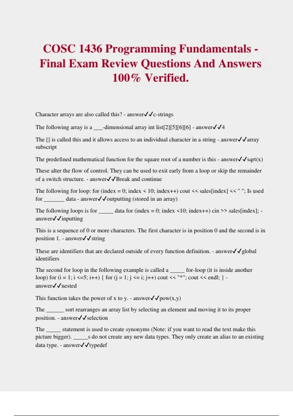 COSC 1436 Programming Fundamentals - Final Exam Review Questions And Answers 100% Verified. Character arrays are also called this? - answerc-strings The following array is a ___-dimensional array int list[2][5][6][6] - answer4 The [] is called this and it allows access to an individual character in a string - answerarray subscript The predefined mathematical function for the square root of a number is this - answersqrt(x) These alter the flow of control. They can be used to exit early from a loop or skip the remainder of a switch structure. - answerBreak and continue The following for loop: for (index = 0; index < 10; index++) cout << sales[index] << " "; Is used for _______ data - answeroutputting (stored in an array) The following loops is for _____ data for (index = 0; index <10; index++) cin >> sales[index]; - answerinputting This is a sequence of 0 or more characters. The first character is in position 0 and the second is in position 1. - answerstring These are identifiers that are declared outside of every function definition. - answerglobal identifiers The second for loop in the following example is called a _____ for-loop (it is inside another loop) for (i = 1; i <=5; i++) { for (j = 1; j <= i; j++) cout << "*"; cout << endl; } - answernested This function takes the power of x to y. - answerpow(x,y) The ______ sort rearranges an array list by selecting