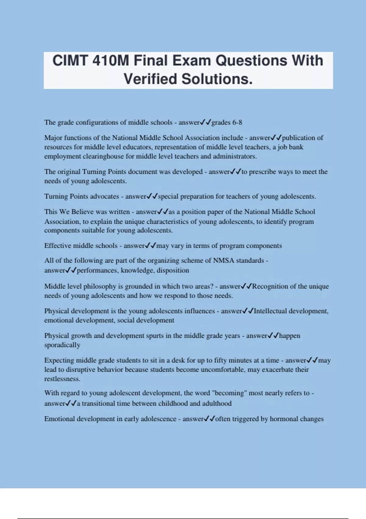 CIMT 410M Final Exam Questions With Verified Solutions. The grade configurations of middle schools - answergrades 6-8 Major functions of the National Middle School Association include - answerpublication of resources for middle level educators, representation of middle level teachers, a job bank employment clearinghouse for middle level teachers and administrators. The original Turning Points document was developed - answerto prescribe ways to meet the needs of young adolescents. Turning Points advocates - answerspecial preparation for teachers of young adolescents. This We Believe was written - answeras a position paper of the National Middle School Association, to explain the unique characteristics of young adolescents, to identify program components suitable for young adolescents. Effective middle schools - answermay vary in terms of program components All of the following are part of the organizing scheme of NMSA standards - answerperformances, knowledge, disposition Middle level philosophy is grounded in which two areas? - answerRecognition of the unique needs of young adolescents and how we respond to those needs. Physical development is the young adolescents influences - answerIntellectual development, emotional development, social development Physical growth and development spurts in the middle grade years - answerhappen sporadically Expecting middle grade students to sit in a desk for up to fifty minutes at a time - answermay lead to disruptive behavior because students become uncomfortable, may exacerbate their restlessness. With regard to young adolescent development, the word "becoming" most nearly refers to - answera transitional time between childhood and adulthood Emotional development in early adolescence - answeroften triggered by hormonal changes