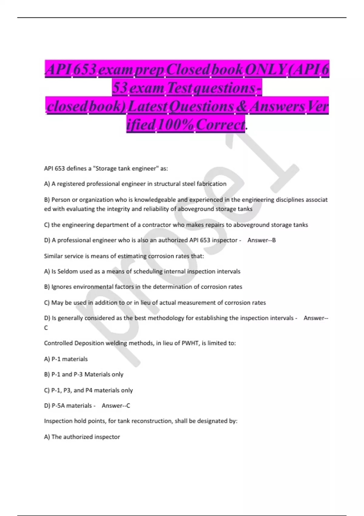 API 653 exam prep Closed book ONLY (API 653 exam Test questions - closed book) Latest Questions & Answers Verified 100% Correct.