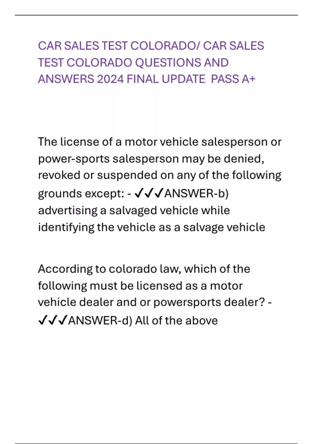 CAR SALES TEST COLORADO/ CAR SALES TEST COLORADO QUESTIONS AND ANSWERS 2024 FINAL UPDATE PASS A+ The license of a motor vehicle salesperson or power-sports salesperson may be denied, revoked or suspended on any of the following grounds except: - ANSWER-b) advertising a salvaged vehicle while identifying the vehicle as a salvage vehicle According to colorado law, which of the following must be licensed as a motor vehicle dealer and or powersports dealer? - ANSWER-d) All of the above