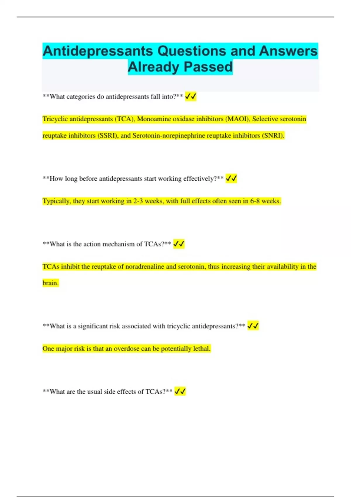 Antidepressants Questions and Answers Already Passed