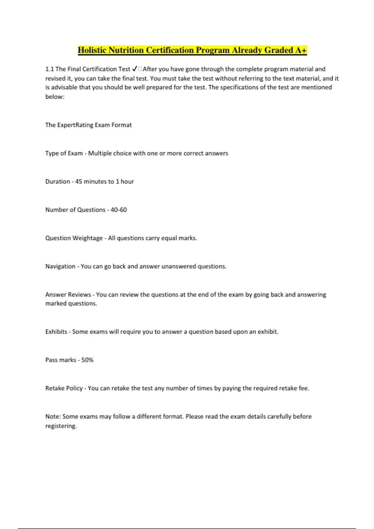 Holistic Nutrition Certification Program Already Graded A+ 1.1 The Final Certification Test ️After you have gone through the complete program material and revised it, you can take the final test. You must take the test without referring to the text material, and it is advisable that you should be well prepared for the test. The specifications of the test are mentioned below: The ExpertRating Exam Format Type of Exam - Multiple choice with one or more correct answers Duration - 45 minutes to 1 hour Number of Questions - 40-60 Question Weightage - All questions carry equal marks. Navigation - You can go back and answer unanswered questions. Answer Reviews - You can review the questions at the end of the exam by going back and answering marked questions. Exhibits - Some exams will require you to answer a question based upon an exhibit. Pass marks - 50% Retake Policy - You can retake the test any number of times by paying the required retake fee. Note: Some exams may follow a different format. Please read the exam details carefully before registering. All successful candidates will receive a hardcopy Certificate of Accomplishment stating that they have completed all the requirements of the Holistic Nutrition Certification process. This certificate can be used as an instrument for marketing your holistic nutrition services as well as for seeking a job. It will take about 3 weeks to get your certificate through registered post. You will also get an online transcript that you can immediately use to display your test marks and highlight the areas you are proficient in. You can link to the online transcript from your website or ask friends, relatives or business associates to look it up on the Internet. 2.1 Truths About Diets ️When studying the ancient diets that different cultures ate, it's important to realize that there are always truths about the diets. Basic Macronutrients for Survival: Every diet for a human must have protein, fat and carbohydrate in it. Although you can alter the compositions of these three macronutrients in the diet, you need them all for sustaining a healthy diet over time. It is possible to eliminate fat temporarily, but it will always lead to consequences. It is also possible to lower carbohydrates to a very low level, and again, there will be consequences. Similarly, you can lower protein to a very low level, and it will result in consequences. 2. An Ancestral Diet Cannot Be Duplicated Now: Every ancient or ancestral diet may have been good for that time in history when it was observed, but it doesn't mean it is good now. The supply of food has changed radically since the beginning of time—or, maybe, even from 1,000 years ago. Due to genetic engineering and the industrialization of today's society, the same foods are not available that were available hundreds of years ago. Foods are often packaged and loaded with food preservatives and chemicals to extend their shelf-life. They are loaded with sugars—some that didn't even exist decades ago—and that harm the body. Even in the meat and poultry department, the meats now available at most grocery stores are not the ones that resemble meats from days gone by. 3. Pollution Must Always Be Considered: Environmental pollution should play a big role in food choices for one's diet. Where a food is originally sourced from makes a big difference in how nourishing that food will be to your health or how damaging it will be to you. This is primarily due to the heavy metals and pesticides in the environment but it also refers to the bacterial contamination of the