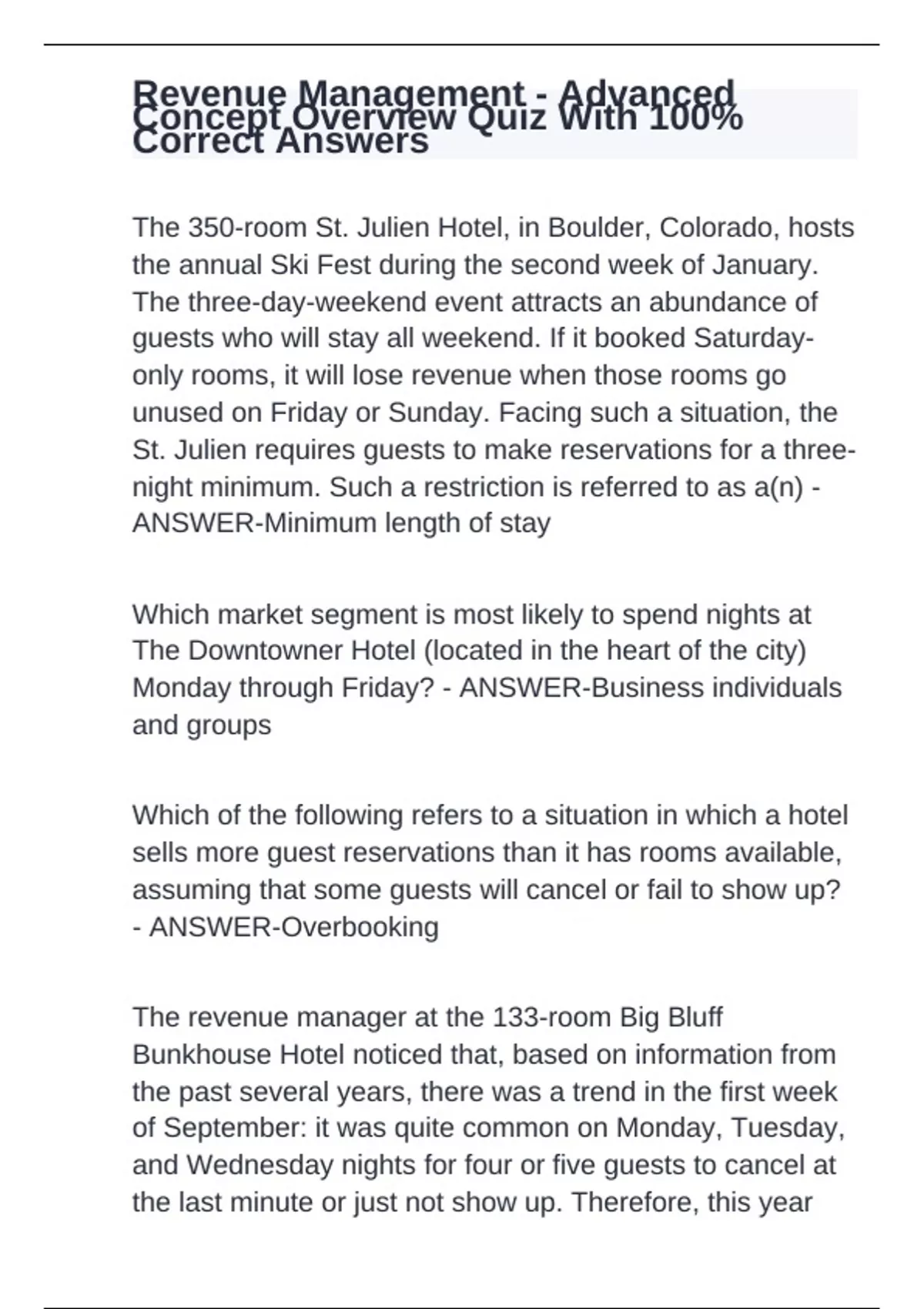 Revenue Management - Advanced Concept Overview Quiz With 100% Correct Answers