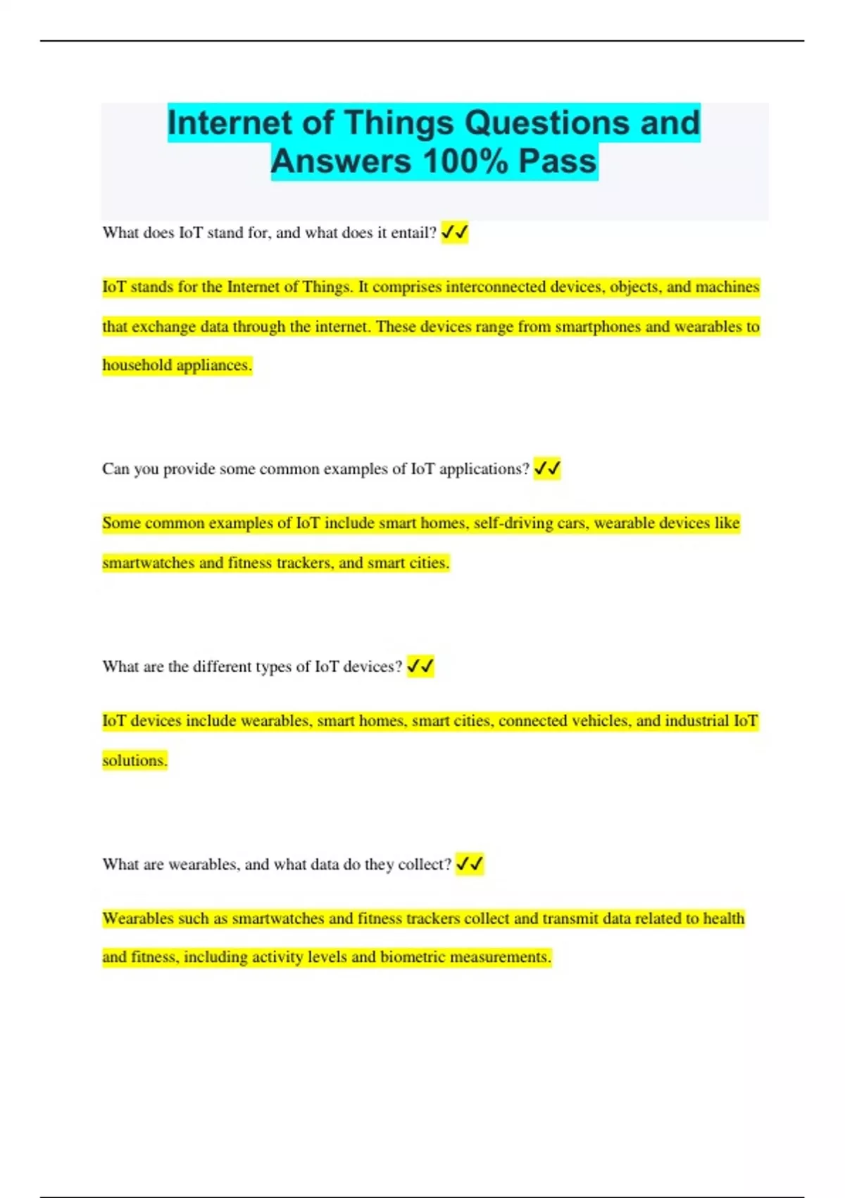 Internet of Things Questions and Answers 100% Pass What does IoT stand for, and what does it entail? IoT stands for the Internet of Things. It comprises interconnected devices, objects, and machines that exchange data through the internet. These devices range from smartphones and wearables to household appliances. Can you provide some common examples of IoT applications? Some common examples of IoT include smart homes, self-driving cars, wearable devices like smartwatches and fitness trackers, and smart cities. What are the different types of IoT devices? IoT devices include wearables, smart homes, smart cities, connected vehicles, and industrial IoT solutions. What are wearables, and what data do they collect? Wearables such as smartwatches and fitness trackers collect and transmit data related to health and fitness, including activity levels and biometric measurements. What are the functionalities of IoT sensors? Sensors in IoT devices gather data like temperature, humidity, motion, and light levels in realtime. What roles do IoT actuators play in IoT systems? Actuators control physical devices based on sensor data, such as adjusting valves, turning lights on/off, or regulating temperature. How does connectivity benefit IoT devices? Connectivity enables IoT devices to communicate with each other and with cloud-based systems for data exchange and remote control. What are IoT sensors, and what types are commonly used? IoT sensors detect physical or environmental conditions like temperature, humidity, pressure, motion, light, and proximity. Can you name some types of IoT sensors and their functions? Types of IoT sensors include temperature sensors, humidity sensors, pressure sensors, motion sensors, light sensors, and proximity sensors. What are IoT actuators, and what actions do they perform? IoT actuators control physical devices or systems based on data from sensors, such as opening valves, adjusting lights, or managing HVAC systems. Can you give examples of IoT actuators? Examples of IoT actuators include motorized valves, electronic locks, smart lighting systems, and HVAC systems. What role do IoT gateways play in IoT ecosystems? IoT gateways provide connectivity between IoT devices and cloud-based platforms for data collection, processing, and analysis. They manage communication protocols, data storage, and security. Examples of IoT gateways includes: 1.Wi-Fi gateways 2.Cellular gateways 3.Zigbee gateways 4.LoRa gateways IoT Edge Devices are devices that process data locally, at the edge of the network, rather than sending it to the cloud for processing. IoT edge devices are used to reduce latency, increase efficiency, and improve security by processing data closer to its source. Examples of IoT edge devices include: 1.Edge servers 2.Edge routers 3.Edge gateways 4.Edge computing devices IoT cloud-based platforms are cloud-based services that provide data storage, processing, and analysis capabilities for IoT systems. IoT cloud-based platforms are responsible for collecting and analyzing data from sensors and providing insights and recommendations based on the data. Examples of IoT cloud-based platforms include: 1.Amazon Web Services IoT 2.Microsoft Azure IoT 3.IBM Watson IoT 4.Google Cloud IoT Applications of IoT Devices and Sensors •In healthcare, IoT devices are used to monitor patients and improve the delivery of care. •In agriculture, IoT devices and sensors are used to optimize crop production and improve yield. •In manufacturing, IoT devices are used to monitor equipment and improve efficiency. •In transportation, IoT devices are used to monitor vehicle performance and enhance safety. •In environmental monitoring, IoT devices and sensors are used to monitor air and water quality, weather conditions, and natural disasters. IoT Networks: Connectivity Options for IoT Devices IoT devices can be connected using a variety of connectivity options, including Wi-Fi, cellular, and Bluetooth. Each option has its own set of benefits and limitations, and the choice of connectivity option will depend on the specific needs and use cases of the IoT devices. Wi-Fi Connectivity (Wi-Fi) is a popular connectivity option for IoT devices due to its widespread availability and reliability. Wi-Fi allows IoT devices to connect to the internet and other devices within a local area network (LAN). Wi-Fi-enabled IoT devices can be controlled remotely and can transmit