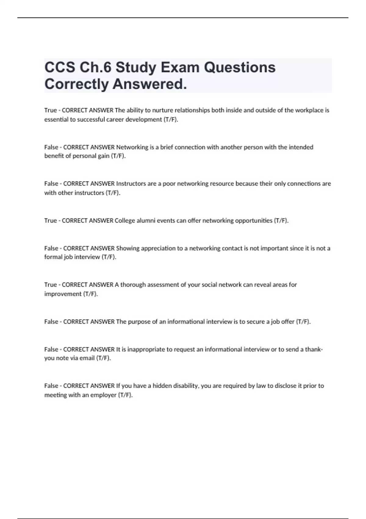 CCS Ch.6 Study Exam Questions Correctly Answered. True - CORRECT ANSWER The ability to nurture relationships both inside and outside of the workplace is essential to successful career development (T/F). False - CORRECT ANSWER Networking is a brief connection with another person with the intended benefit of personal gain (T/F). False - CORRECT ANSWER Instructors are a poor networking resource because their only connections are with other instructors (T/F). True - CORRECT ANSWER College alumni events can offer networking opportunities (T/F). False - CORRECT ANSWER Showing appreciation to a networking contact is not important since it is not a formal job interview (T/F). True - CORRECT ANSWER A thorough assessment of your social network can reveal areas for improvement (T/F). False - CORRECT ANSWER The purpose of an informational interview is to secure a job offer (T/F). False - CORRECT ANSWER It is inappropriate to request an informational interview or to send a thank-you note via email (T/F). False - CORRECT ANSWER If you have a hidden disability, you are required by law to disclose it prior to meeting with an employer (T/F). True - CORRECT ANSWER To broaden your professional network, it is a good idea to make a list of people you know who might have information about your career, then make a list of three more people each of your contacts knows whom you would like to meet (T/F).