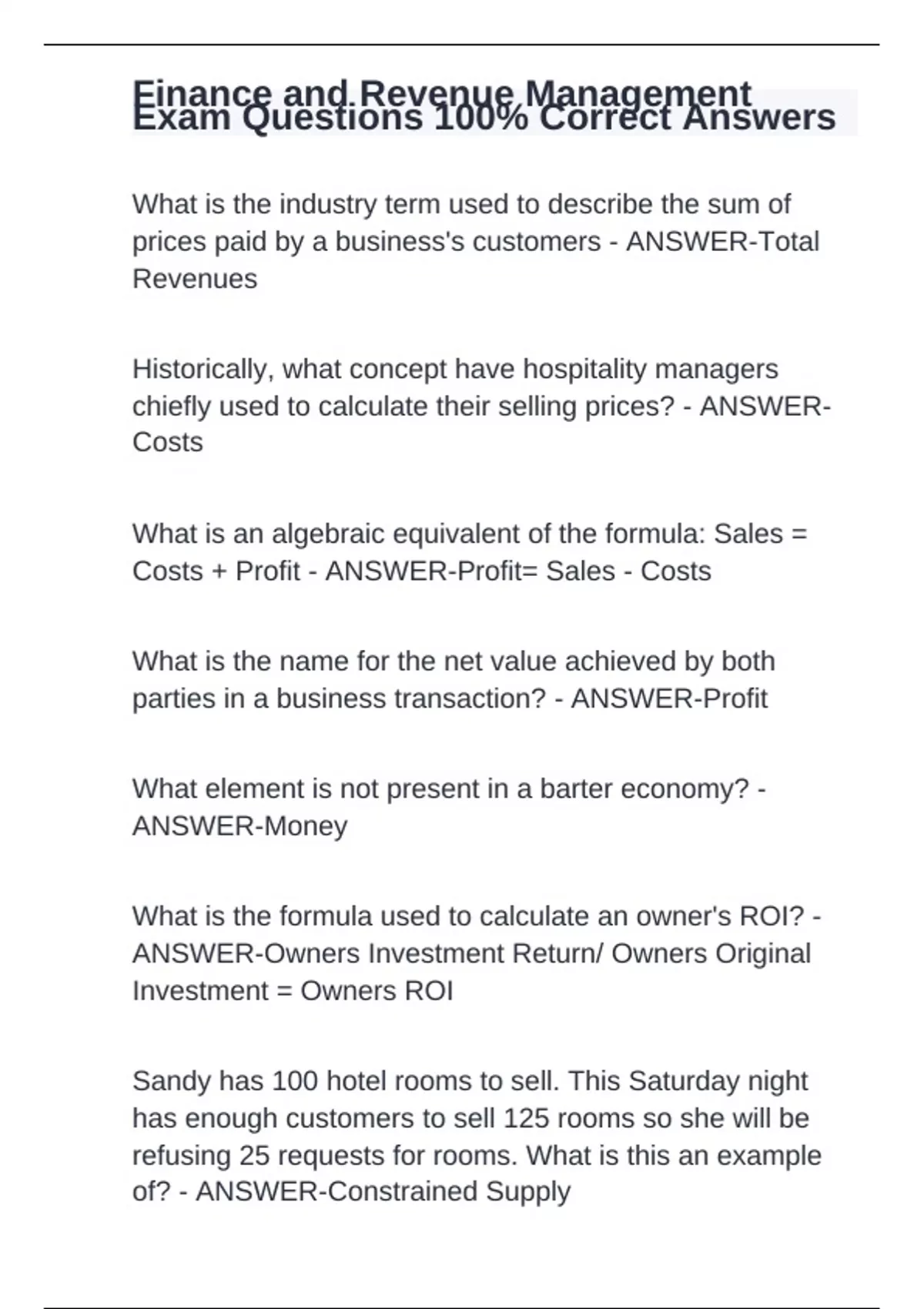 Finance and Revenue Management Exam Questions 100% Correct Answers