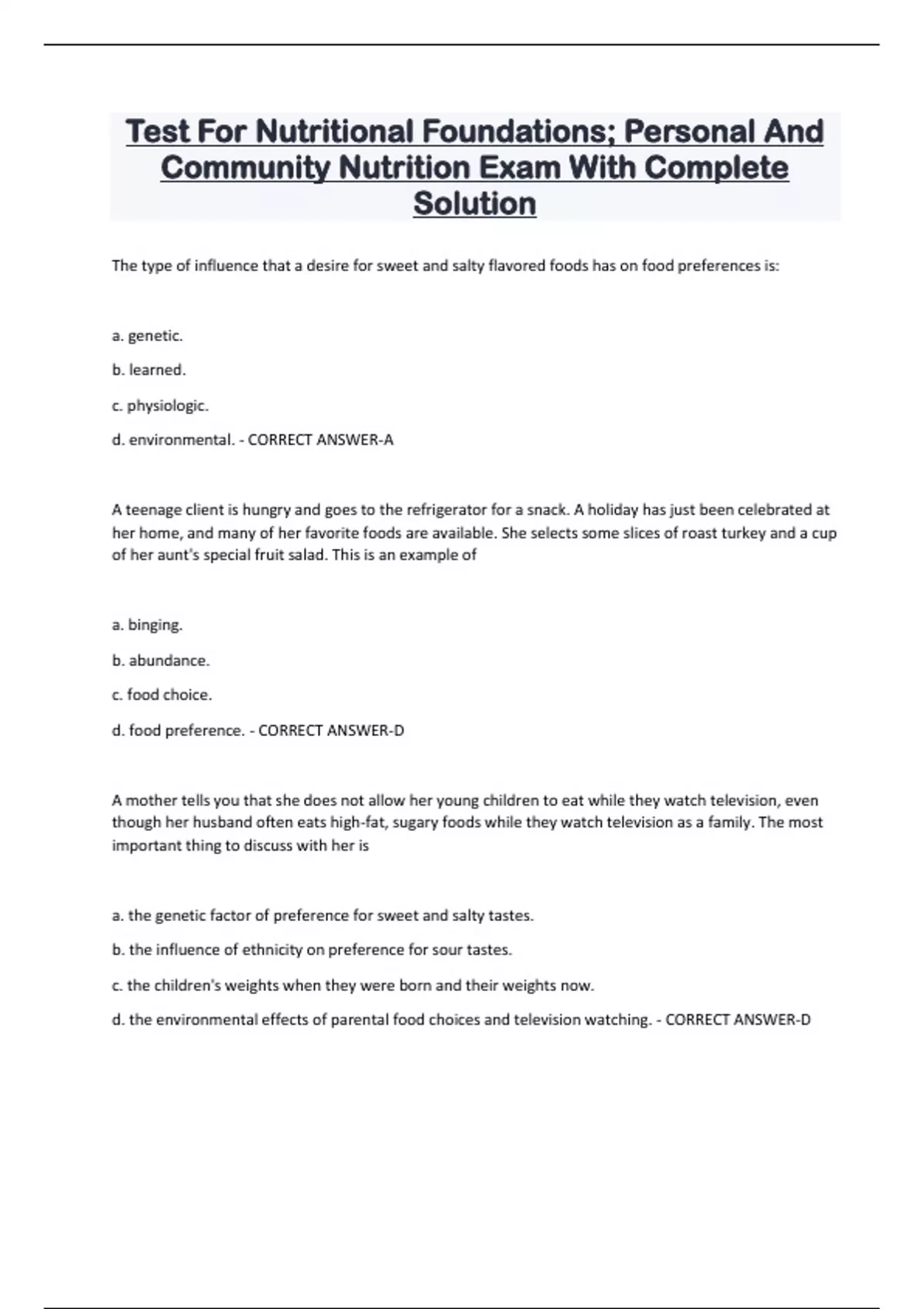 Test For Nutritional Foundations; Personal And Community Nutrition Exam With Complete Solution The type of influence that a desire for sweet and salty flavored foods has on food preferences is: a. genetic. b. learned. c. physiologic. d. environmental. - CORRECT ANSWER-A A teenage client is hungry and goes to the refrigerator for a snack. A holiday has just been celebrated at her home, and many of her favorite foods are available. She selects some slices of roast turkey and a cup of her aunt's special fruit salad. This is an example of