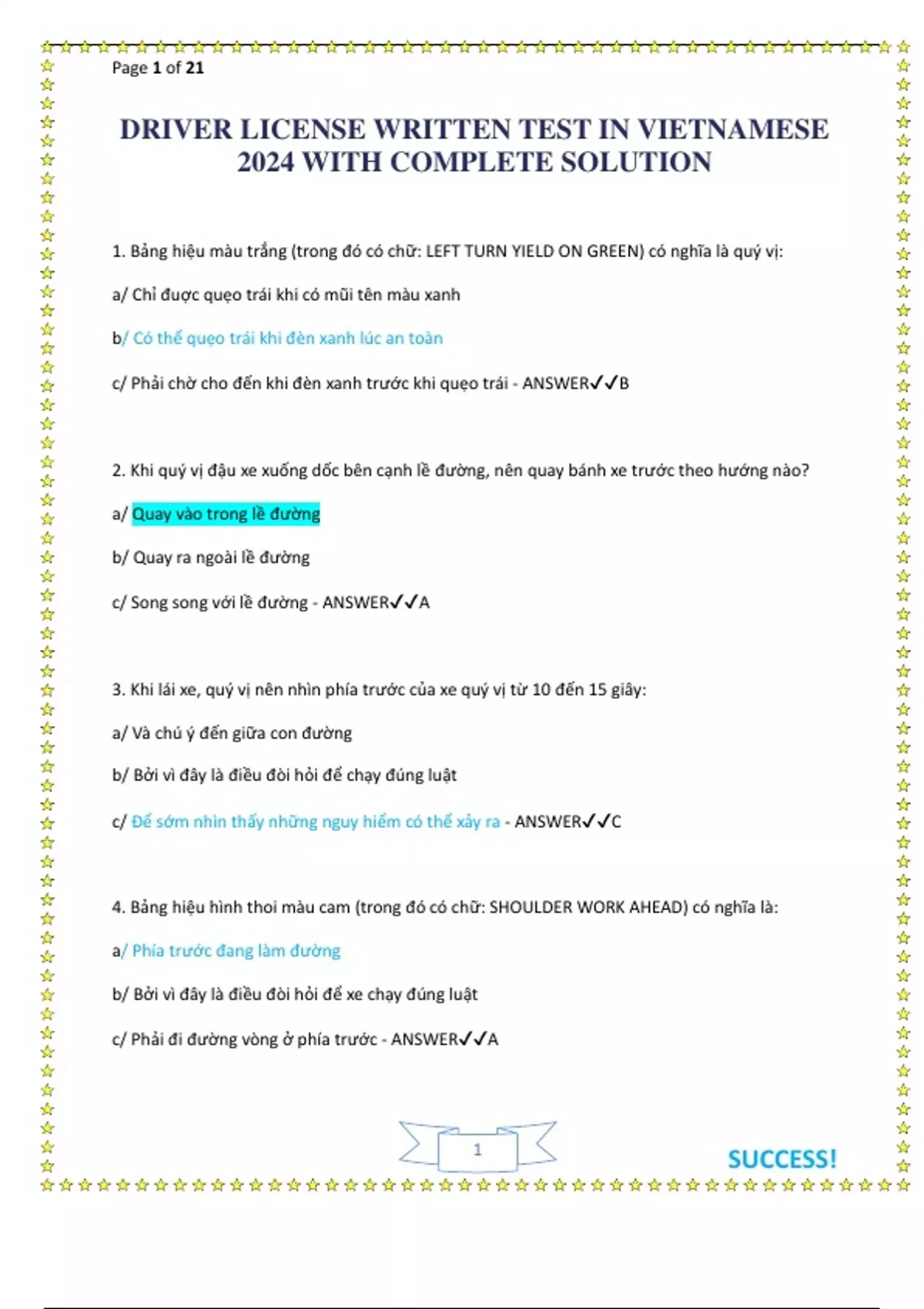 DRIVER LICENSE WRITTEN TEST IN VIETNAMESE 2024 WITH COMPLETE SOLUTION