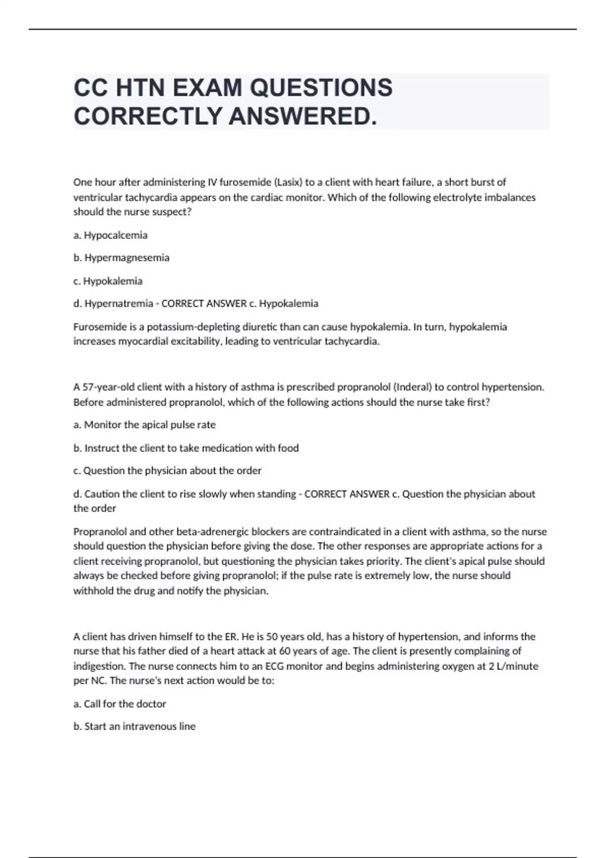CC HTN EXAM QUESTIONS CORRECTLY ANSWERED. One hour after administering IV furosemide (Lasix) to a client with heart failure, a short burst of ventricular tachycardia appears on the cardiac monitor. Which of the following electrolyte imbalances should the nurse suspect? a. Hypocalcemia b. Hypermagnesemia c. Hypokalemia d. Hypernatremia - CORRECT ANSWER c. Hypokalemia Furosemide is a potassium-depleting diuretic than can cause hypokalemia. In turn, hypokalemia increases myocardial excitability, leading to ventricular tachycardia. A 57-year-old client with a history of asthma is prescribed propranolol (Inderal) to control hypertension. Before administered propranolol, which of the following actions should the nurse take first? a. Monitor the apical pulse rate b. Instruct the client to take medication with food c. Question the physician about the order d. Caution the client to rise slowly when standing - CORRECT ANSWER c. Question the physician about the order Propranolol and other beta-adrenergic blockers are contraindicated in a client with asthma, so the nurse should question the physician before giving the dose. The other responses are appropriate actions for a client receiving propranolol, but questioning the physician takes priority. The client's apical pulse should always be checked before giving propranolol; if the pulse rate is extremely low, the nurse should withhold the drug and notify the physician. A client has driven himself to the ER. He is 50 years old, has a history of hypertension, and informs the nurse that his father died of a heart attack at 60 years of age. The client is presently complaining of indigestion. The nurse connects him to an ECG monitor and begins administering oxygen at 2 L/minute per NC. The nurse's next action would be to: a. Call for the doctor b. Start an intravenous line c. Obtain a portable chest radiograph d. Draw blood for laboratory studies - CORRECT ANSWER b. Start an intravenous line Advanced cardiac life support recommends that at least one or two intravenous lines be inserted in one or both of the antecubital spaces. Calling the physician, obtaining a portable chest radiograph, and drawing blood are important but secondary to starting the intravenous line. A nurse is assessing the blood pressure of a client diagnosed with primary hypertension. The nurse ensures accurate measurement by avoiding which of the following? a. Seating the client with arm bared, supported, and at heart level. b. Measuring the blood pressure after the client has been seated quietly for 5 minutes. c. Using a cuff with a rubber bladder that encircles at least 80% of the limb. d. Taking a blood pressure within 15 minutes after nicotine or caffeine ingestion. - CORRECT ANSWER d. Taking a blood pressure within 15 minutes after nicotine or caffeine ingestion. BP should be taken with the client seated with the arm bared, positioned with support and at heart level. The client should sit with the legs on the floor, feet uncrossed, and not speak during the recording. The client should not have smoked tobacco or taken in caffeine in the 30 minutes preceding the measurement. The client should rest quietly for 5 minutes before the reading is taken. The cuff bladder should encircle at least 80% of the limb being measured. Gauges other than a mercury sphygmomanometer should be calibrated every 6 months to ensure accuracy.