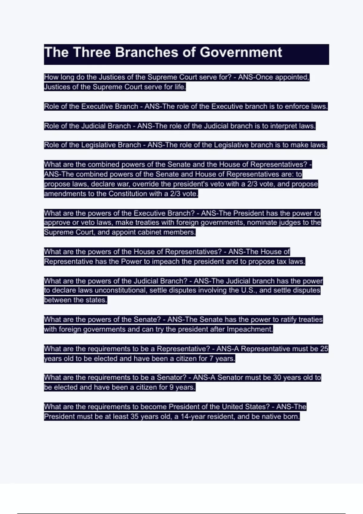 The Three Branches of Governmen Questions with 100% Actual correct answers | verified | latest update | Graded A+ | Already Passed | Complete Solution t. The Three Branches of Government. Questions with 100% Actual correct answers | verified | latest update | Graded A+ | Already Passed | Complete Solution