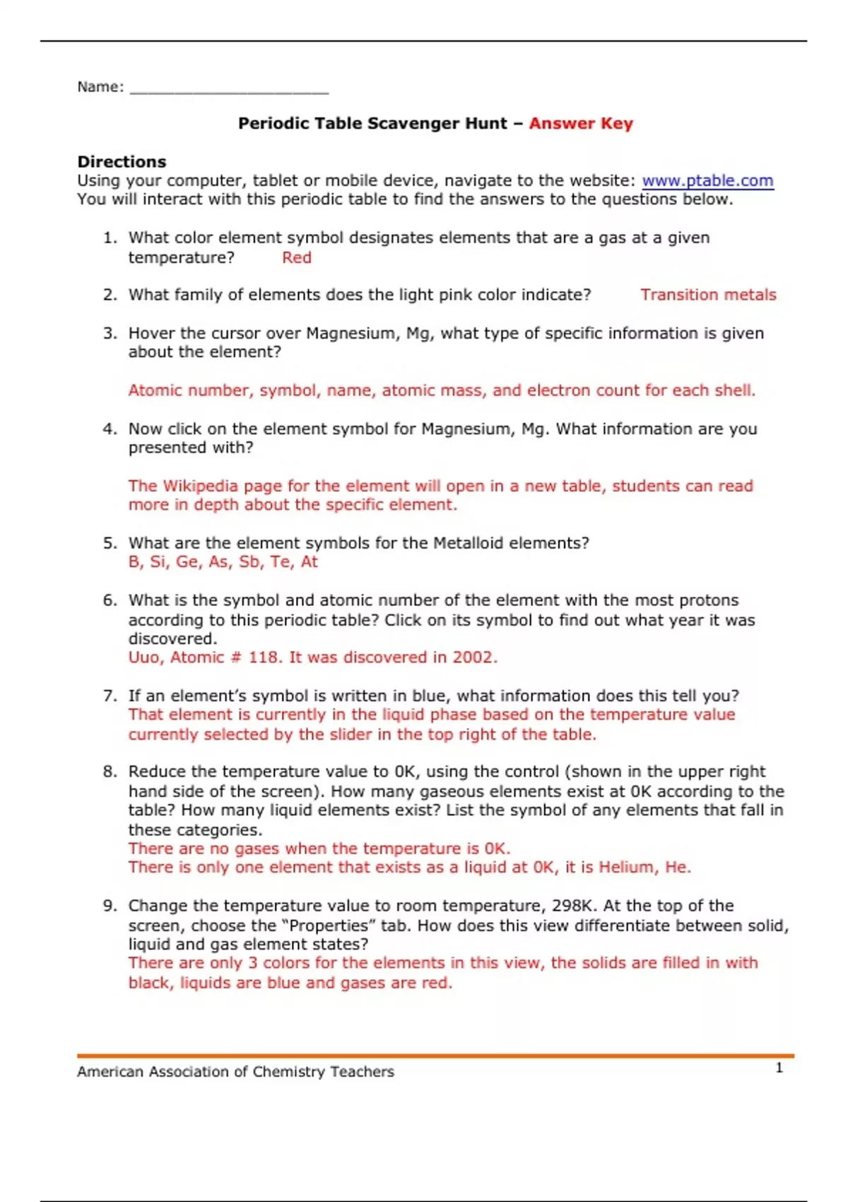 Periodic Table Scavenger Hunt – Answer Key Directions