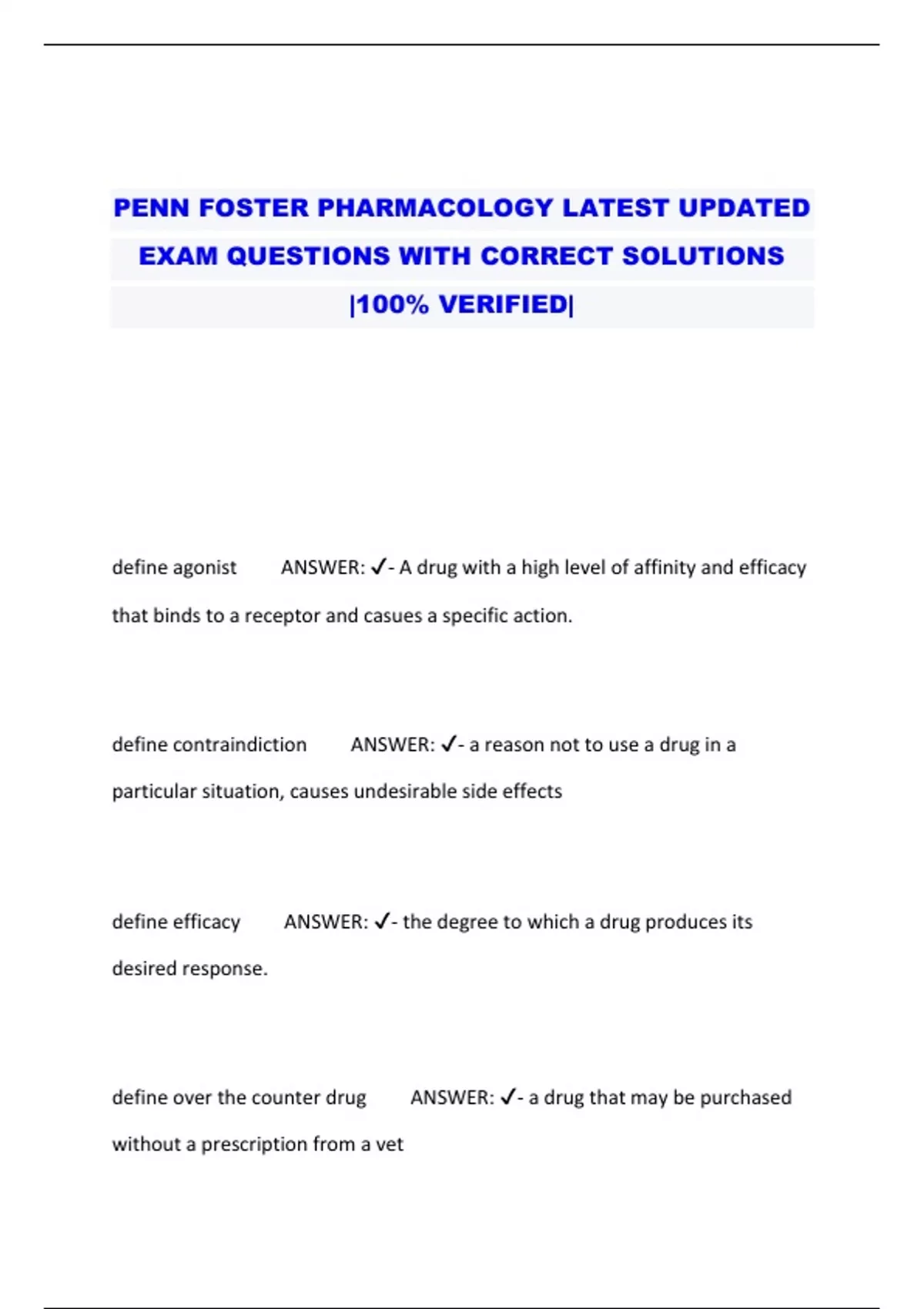 PENN FOSTER PHARMACOLOGY LATEST UPDATED EXAM QUESTIONS WITH CORRECT SOLUTIONS |100% VERIFIED|