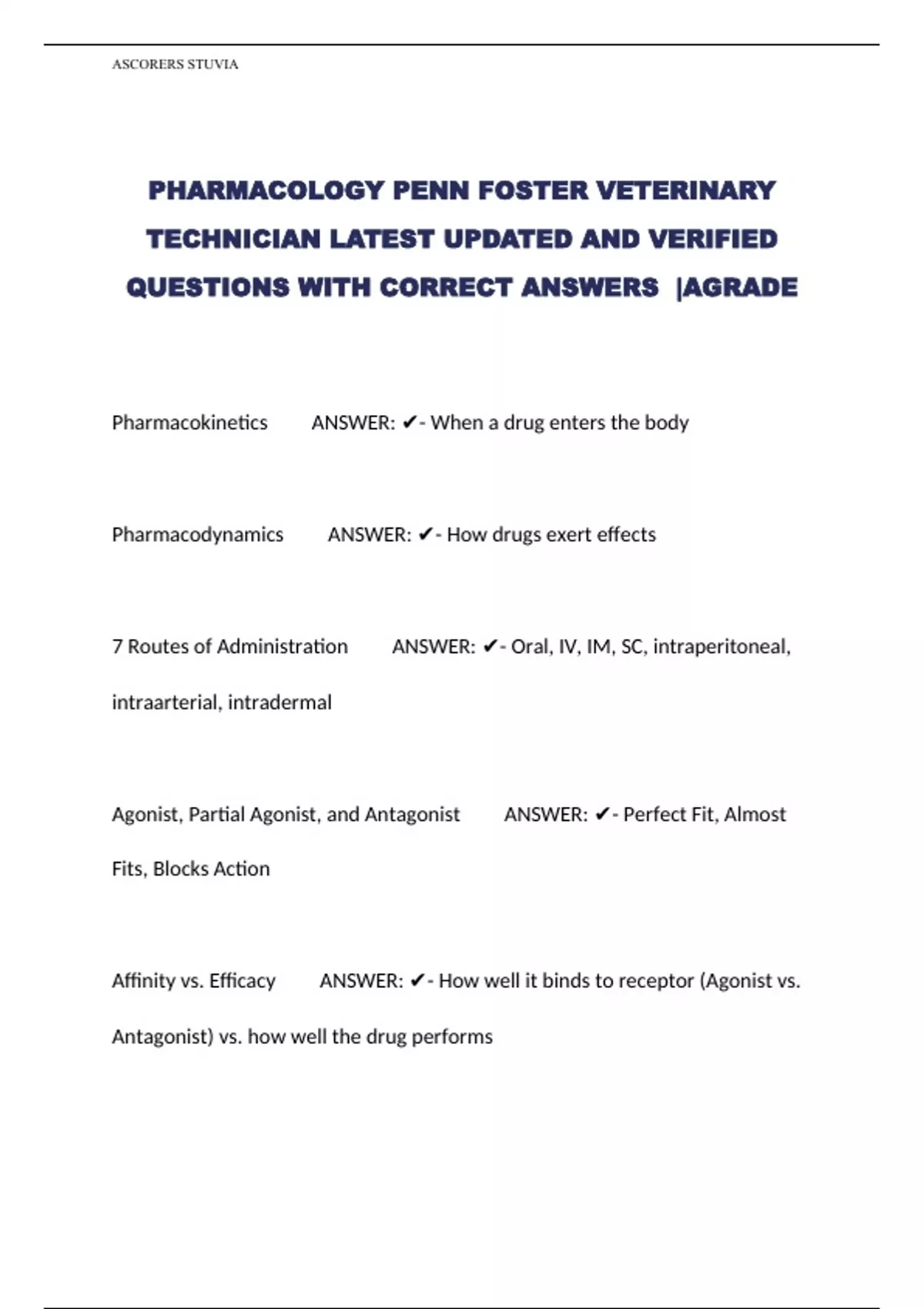 PHARMACOLOGY PENN FOSTER VETERINARY TECHNICIAN LATEST UPDATED AND VERIFIED QUESTIONS WITH CORRECT ANSWERS |AGRADE