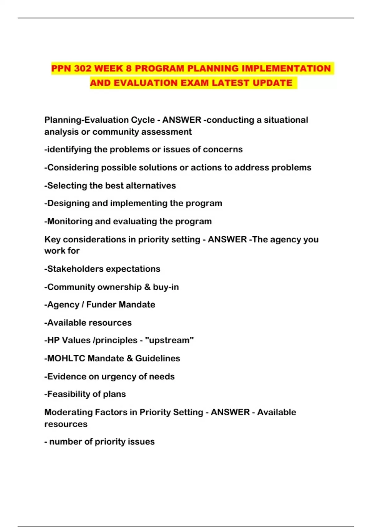 PPN 302 WEEK 8 PROGRAM PLANNING IMPLEMENTATION AND EVALUATION EXAM LATEST UPDATE ...