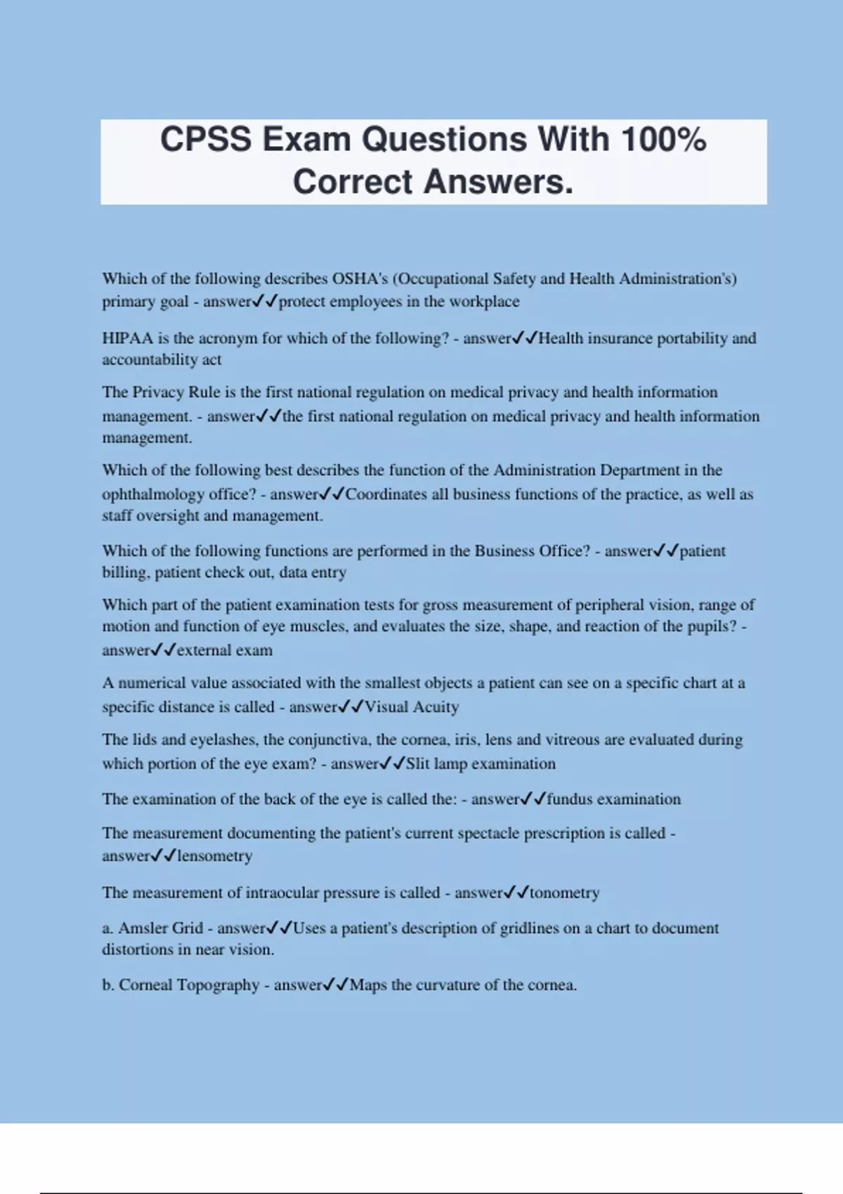 CPSS Exam Questions With 100% Correct Answers. Which of the following describes OSHA's (Occupational Safety and Health Administration's) primary goal - answerprotect employees in the workplace HIPAA is the acronym for which of the following? - answerHealth insurance portability and accountability act The Privacy Rule is the first national regulation on medical privacy and health information management. - answerthe first national regulation on medical privacy and health information management. Which of the following best describes the function of the Administration Department in the ophthalmology office? - answerCoordinates all business functions of the practice, as well as staff oversight and management. Which of the following functions are performed in the Business Office? - answerpatient billing, patient check out, data entry Which part of the patient examination tests for gross measurement of peripheral vision, range of motion and function of eye muscles, and evaluates the size, shape, and reaction of the pupils? - answerexternal exam A numerical value associated with the smallest objects a patient can see on a specific chart at a specific distance is called - answerVisual Acuity The lids and eyelashes, the conjunctiva, the cornea, iris, lens and vitreous are evaluated during which portion of the eye exam? - answerSlit lamp examination The examination of the back of the eye is called the: - answerfundus examination The measurement documenting the patient's current spectacle prescription is called - answerlensometry The measurement of intraocular pressure is called - answertonometry a. Amsler Grid - answerUses a patient's description of gridlines on a chart to document distortions in near vision. b. Corneal Topography - answerMaps the curvature of the cornea. d. Extended Ophthalmoscopy - answerUses special magnification to see retinal detail and includes a color drawing of the detail and interpretation by the physician. e. Fluorescein Angiography - answerAllows for viewing the appearance of retinal blood vessels as dye injected into the patient's arm flows through the blood vessels. g. Nerve Fiber Analyzer - answerCaptures the appearance of the fibers of the optic nerve. h. Pachymetry - answerMeasures the thickness of the cornea. j. Ultrasonography (biometry) - answerMeasures the length of the eye to assist in calculating the power of an intraocular lens to be used in cataract surgery. a. Age-related macular degeneration (ARMD) - answerDegeneration of the macula resulting in loss of central and reading vision. h. Dry Eye Syndrome - answer. Insufficient tear production m. Pseudophakia - answerDiagnosis resulting from removal of cataract with implantation of intraocular lens. o. Secondary Membrane - answerClouding of membrane of the lens after cataract surgery. Patient's charts are prepared - answerat the time the patient arrives for his/her appointment. Patient registration processes are normally completed: - answerupon check in Encounter forms are most commonly used to: - answerrecord the diagnosis and procedural codes Registration information should be: - answerRoutinely reviewed for each patient upon arrival Payment receipts should be used: - answerTo record all payments received from patients Accounts Receivable (A/R). - answerThe balance due on services rendered by the practice The ancillary testing room is used for: - answerDiagnostic testing (A-Scan, B-Scan, and corneal topography) An auto refractor is used to; - answerc. Help determine the eyeglasses prescription. An A-Scan is a piece of ultrasound equipment used to - answerMeasure the length of the eye to assist in calculating the power of an intraocular lens for cataract surgery The Snellen acuity chart is used to - answerMeasure visual acuity using various sizes of letters visible to the normal eye A lensometer is used to - answerMeasure the patient's current spectacle prescription