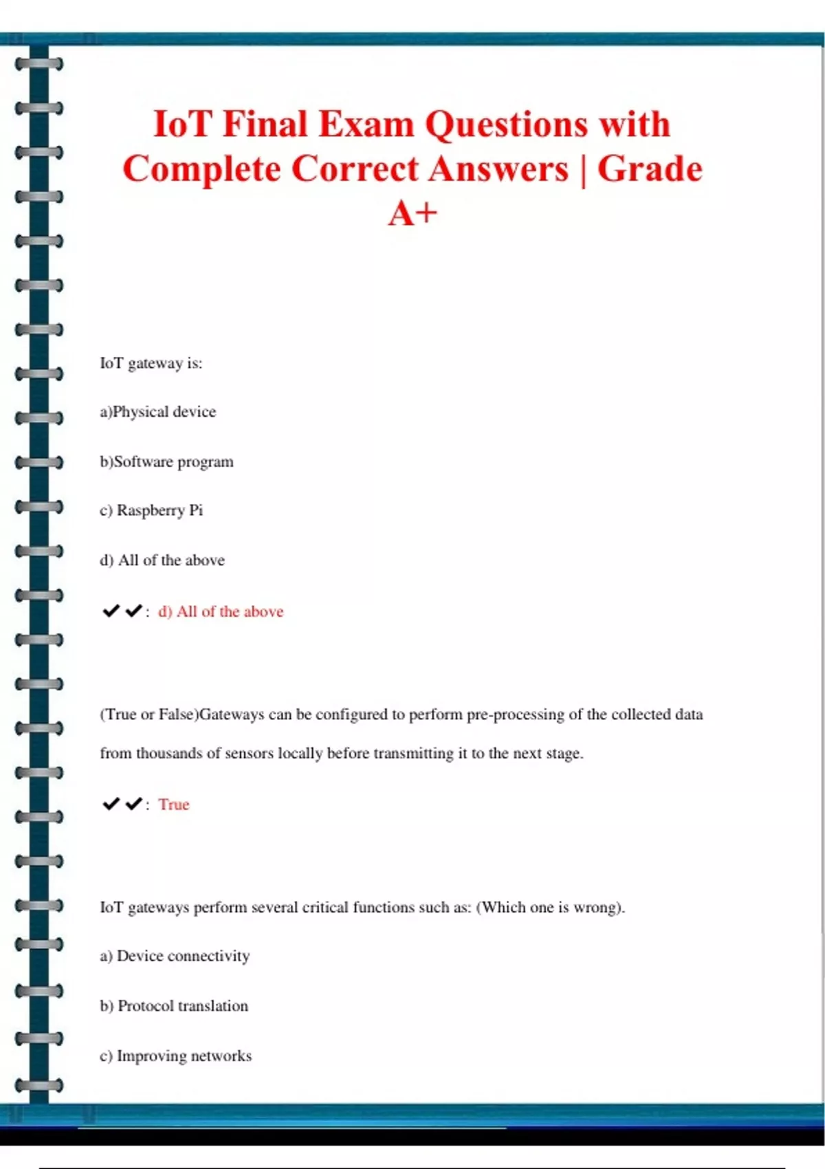 IoT gateway is: a)Physical device b)Software program c) Raspberry Pi d) All of the above : d) All of the above (True or False)Gateways can be configured to perform pre-processing of the collected data from thousands of sensors locally before transmitting it to the next stage. : True IoT gateways perform several critical functions such as: (Which one is wrong). a) Device connectivity b) Protocol translation c) Improving networks d)Data filtering and processing, security : c) Improving networks An IoT gateway device bridges the communication gap between: (Which one is wrong). a) end users b) IoT devices c) Sensors d) cloud : a) end users Before purchasing one gateway device you should consider: (Which one is wrong). a) Network Security b) Uptime c) Power d) Downtime : b) uptime Which one isn't key core principles of security for IoT gateway. a) Strategy b) Confidentiality c) integrity d) authentication : a) strategy Which device is often to be attacked in IoT system. a) Sensor b)Actuator c) Gateway d) Cloud Server : Gateway