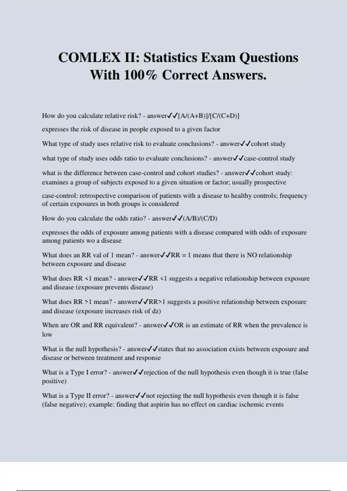 COMLEX II: Statistics Exam Questions With 100% Correct Answers. How do you calculate relative risk? - answer[A/(A+B)]/[C/(C+D)] expresses the risk of disease in people exposed to a given factor What type of study uses relative risk to evaluate conclusions? - answercohort study what type of study uses odds ratio to evaluate conclusions? - answercase-control study what is the difference between case-control and cohort studies? - answercohort study: examines a group of subjects exposed to a given situation or factor; usually prospective case-control: retrospective comparison of patients with a disease to healthy controls; frequency of certain exposures in both groups is considered How do you calculate the odds ratio? - answer(A/B)/(C/D) expresses the odds of exposure among patients with a disease compared with odds of exposure among patients wo a disease What does an RR val of 1 mean? - answerRR = 1 means that there is NO relationship between exposure and disease What does RR <1 mean? - answerRR <1 suggests a negative relationship between exposure and disease (exposure prevents disease) What does RR >1 mean? - answerRR>1 sug