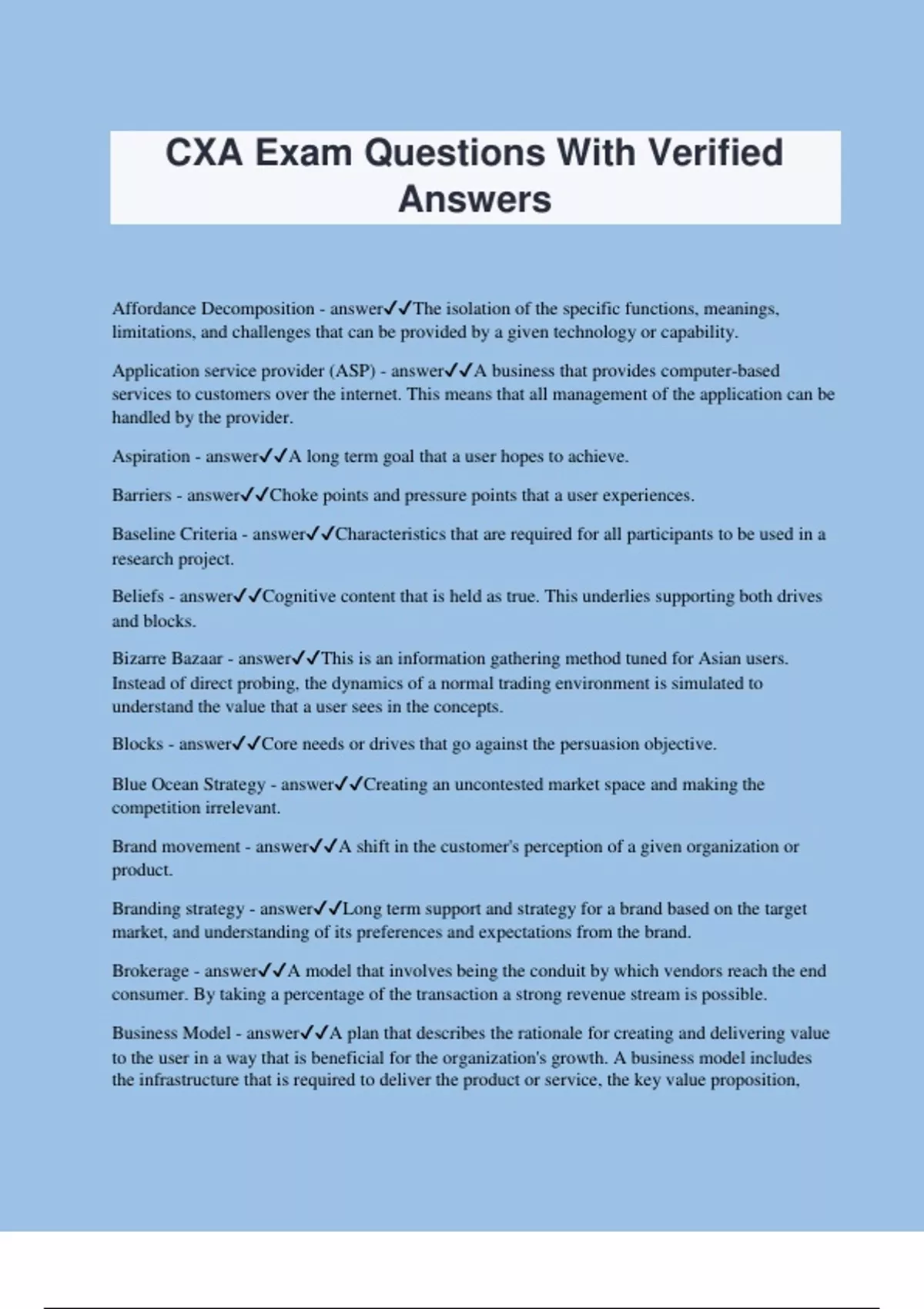 CXA Exam Questions With Verified Answers Affordance Decomposition - answerThe isolation of the specific functions, meanings, limitations, and challenges that can be provided by a given technology or capability. Application service provider (ASP) - answerA business that provides computer-based services to customers over the internet. This means that all management of the application can be handled by the provider. Aspiration - answerA long term goal that a user hopes to achieve. Barriers - answerChoke points and pressure points that a user experiences. Baseline Criteria - answerCharacteristics that are required for all participants to be used in a research project. Beliefs - answerCognitive content that is held as true. This underlies supporting both drives and blocks. Bizarre Bazaar - answerThis is an information gathering method tuned for Asian users. Instead of direct probing, the dynamics of a normal trading environment is simulated to understand the value that a user sees in the concepts. Blocks - answerCore needs or drives that go against the persuasion objective. Blue Ocean Strategy - answerCreating an uncontested market space and making the competition irrelevant. Brand movement - answerA shift in the customer's perception of a given organization or product. Branding strategy - answerLong term support and strategy for a brand based on the target market, and understanding of its preferences and expectations from the brand. Brokerage - answerA model that involves being the conduit by which vendors reach the end consumer. By taking a percentage of the transaction a strong revenue stream is possible. Business Model - answerA plan that describes the rationale for creating and delivering value to the user in a way that is beneficial for the organization's growth. A business model includes the infrastructure that is required to deliver the product or service, the key value proposition, definition of the target market, the channels, the ecosystem, and the pricing/revenue generation plan. Business positioning - answerDifferentiating your product or service from that of your competitors and determining the market that you want to aim the product and service at. Business Strategy - answerA plan that chalks out the selection and application of the organization's resources to achieve a competitive advantage in the market. CAGR - answerCompound annual growth rate Channel Strategies - answerA plan for sale and distribution of products and services to users that is effective in maximizing the sales and revenue. Choke points - answer"Physical barriers" to performing tasks. Competitive Space Analysis - answerA systematic process for assessing the strengths and weaknesses of current and potential competitors. Crowdsourcing - answerInviting a large group of people to participate in creating new ideas, products and services. Cultural map - answerA visual depiction of important cultural parameters such as cultural dimensions. Cultural probe - answerA method used for the purpose of information gathering for design inspiration. This was first introduced by Bill Gaver from RCA. Culture strain - answerIn spite of culture having a certain orientation, people can behave in a manner that contradicts the dominant orientation. Cultures are not static entities and therfore tehy change and often over a period of time morph into an entity that is different from what it was a generation ago. This is where the gap between what OUGHT TO BE and what IS creates dissonance and hence opportunities for design solutions. Current practices - answerUser's current behaviors, usage of devices, habits and routines. Day in a Life of (DILO) - answerA method for documenting the user's typical and atypical activities during a day. Typically, tasks that the user performs, the environs that the tasks are performed in, the devices that are used and the people that the user interacts with are documented through a DILO. Demographics - answerClassifying people on the basis of characteristics such as age, gender, income, race and education. Design trends - answerThe general direction of form factors, features, functions, color, material and finishes of products and services in the m
