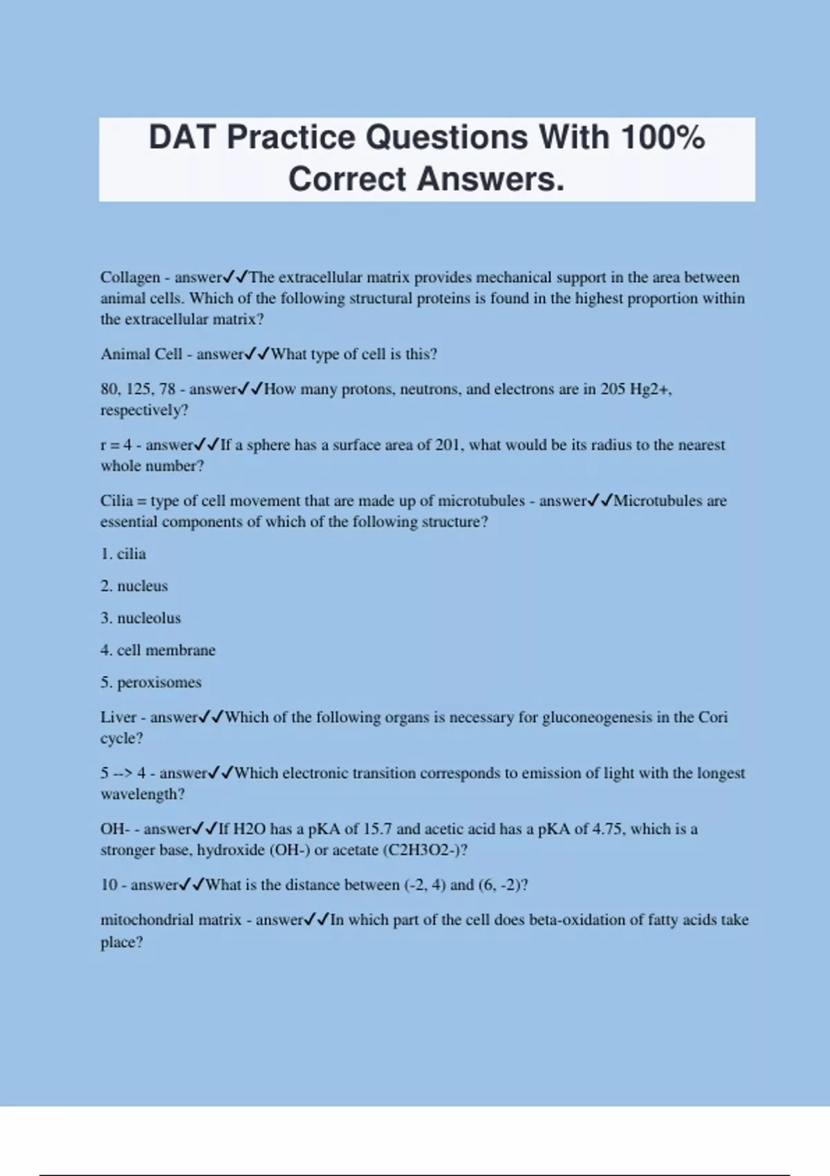 DAT Practice Questions With 100% Correct Answers. Collagen - answerThe extracellular matrix provides mechanical support in the area between animal cells. Which of the following structural proteins is found in the highest proportion within the extracellular matrix? Animal Cell - answerWhat type of cell is this? 80, 125, 78 - answerHow many protons, neutrons, and electrons are in 205 Hg2+, respectively? r = 4 - answerIf a sphere has a surface area of 201, what would be its radius to the nearest whole number? Cilia = type of cell movement that are made up of microtubules - answerMicrotubules are essential components of which of the following structure? 1. cilia 2. nucleus 3. nucleolus 4. cell membrane 5. peroxisomes Liver - answerWhich of the following organs is necessary for gluconeogenesis in the Cori cycle? 5 --> 4 - answerWhich electronic transition corresponds to emission of light with the longest wavelength? OH- - answerIf H2O has a pKA of 15.7 and acetic acid has a pKA of 4.75, which is a stronger base, hydroxide (OH-) or acetate (C2H3O2-)? 10 - answerWhat is the distance between (-2, 4) and (6, -2)? mitochondrial matrix - answerIn which part of the cell does beta-oxidation of fatty acids take place?