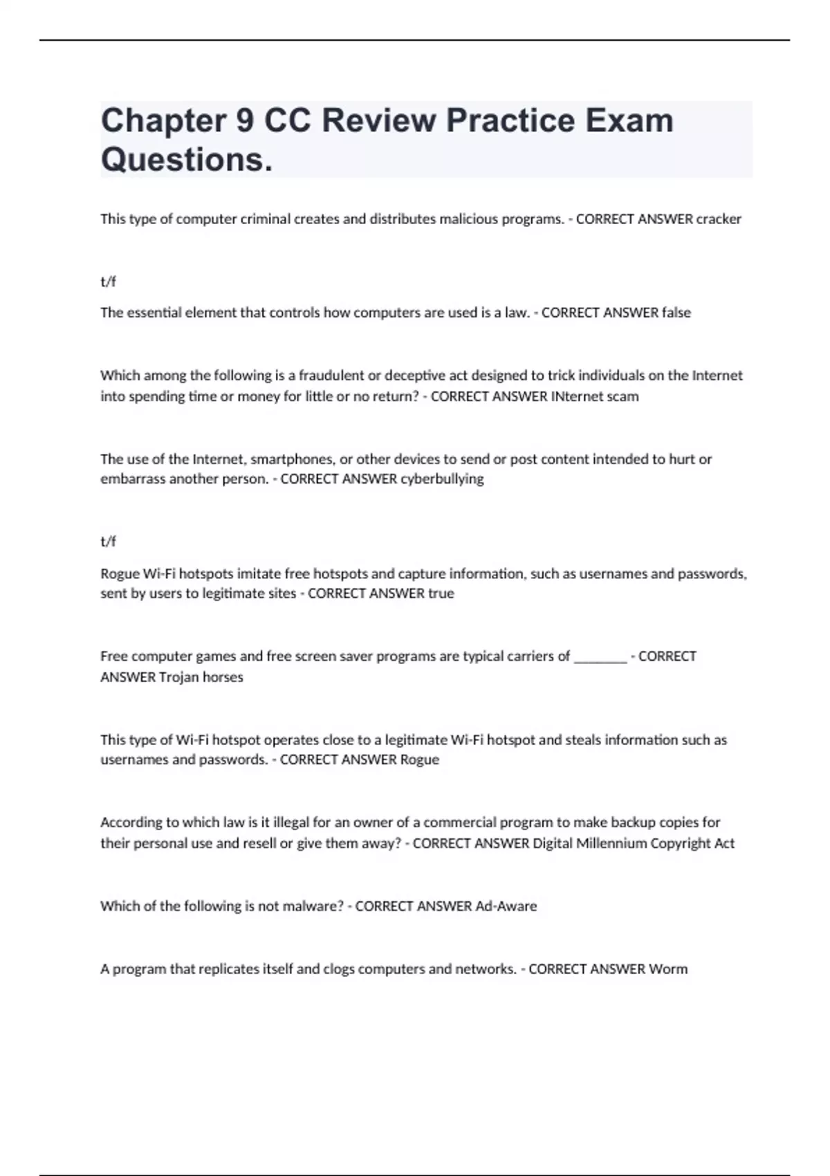 Chapter 9 CC Review Practice Exam Questions. This type of computer criminal creates and distributes malicious programs. - CORRECT ANSWER cracker t/f The essential element that controls how computers are used is a law. - CORRECT ANSWER false Which among the following is a fraudulent or deceptive act designed to trick individuals on the Internet into spending time or money for little or no return? - CORRECT ANSWER INternet scam The use of the Internet, smartphones, or other devices to send or post content intended to hurt or embarrass another person. - CORRECT ANSWER cyberbullying t/f Rogue Wi-Fi hotspots imitate free hotspots and capture information, such as usernames and passwords, sent by users to legitimate sites - CORRECT ANSWER true Free computer games and free screen saver programs are typical carriers of _______ - CORRECT ANSWER Trojan horses This type of Wi-Fi hotspot operates close to a legitimate Wi-Fi hotspot and steals information such as usernames and passwords. - CORRECT ANSWER Rogue According to which law is it illegal for an owner of a commercial program to make backup copies for their personal use and resell or give them away? - CORRECT ANSWER Digital Millennium Copyright Act Which of the following is not malware? - CORRECT ANSWER Ad-Aware A program that replicates itself and clogs computers and networks. - CORRECT ANSWER Worm Small data files that are deposited on a user's hard disk when they visit a website are called _______ - CORRECT ANSWER cookies t/f Computer security is concerned with protecting information, hardware, and software from unauthorized use, as well as preventing or limiting the damage from intrusions, sabotage, and natural disasters. - CORRECT ANSWER true t/f Most browsers offer a privacy mode that ensures that your browsing activity is not recorded on your hard disk. - CORRECT ANSWER true t/f It is highly likely that each one of us has an electronic profile created by information resellers. - CORRECT ANSWER true t/f Identity theft and mistaken identity are the same - CORRECT ANSWER false Which of the following is the most widely used wireless network encryption for home wireless networks? - CORRECT ANSWER WPA2 t/f If copyright-protected music is uploaded to a website, it is legal to download it - CORRECT ANSWER fasle