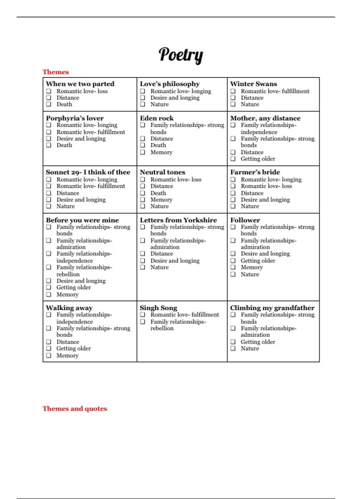❏ Romantic love- fulfillment ❏ Distance ❏ Romantic love- loss