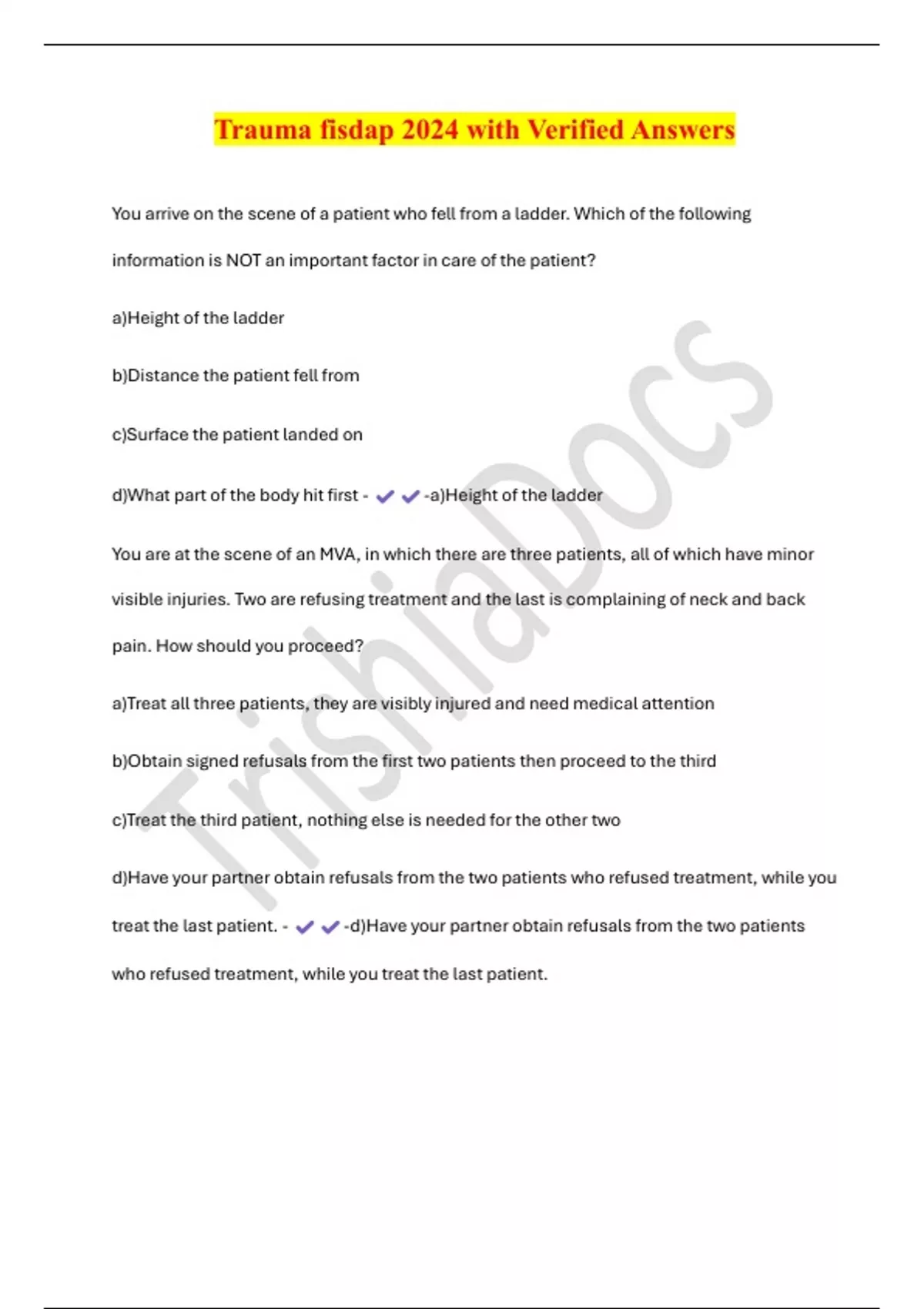 Trauma fisdap 2024 with Verified Answers You arrive on the scene of a patient who fell from a ladder. Which of the following information is NOT an important factor in care of the patient? a)Height of the ladder b)Distance the patient fell from c)Surface the patient landed on d)What part of the body hit first - -a)Height of the ladder You are at the scene of an MVA, in which there are three patients, all of which have minor visible injuries. Two are refusing treatment and the last is complaining of neck and back pain. How should you proceed? a)Treat all three patients, they are visibly injured and need medical attention b)Obtain signed refusals from the first two patients then proceed to the third c)Treat the third patient, nothing else is needed for the other two d)Have your partner obtain refusals from the two patients who refused treatment, while you treat the last patient. - -d)Have your partner obtain refusals from the two patients who refused treatment, while you treat the last patient. Your patient is a 17 year old male found face down in a swimming pool. He is currently being held face up at the surface of the water. He is unconscious but breathing and has a pulse. What is the best course of action for this patient? a)Jump into the pool and begin CPR b)Remove the patient from the pool, immobilize, an