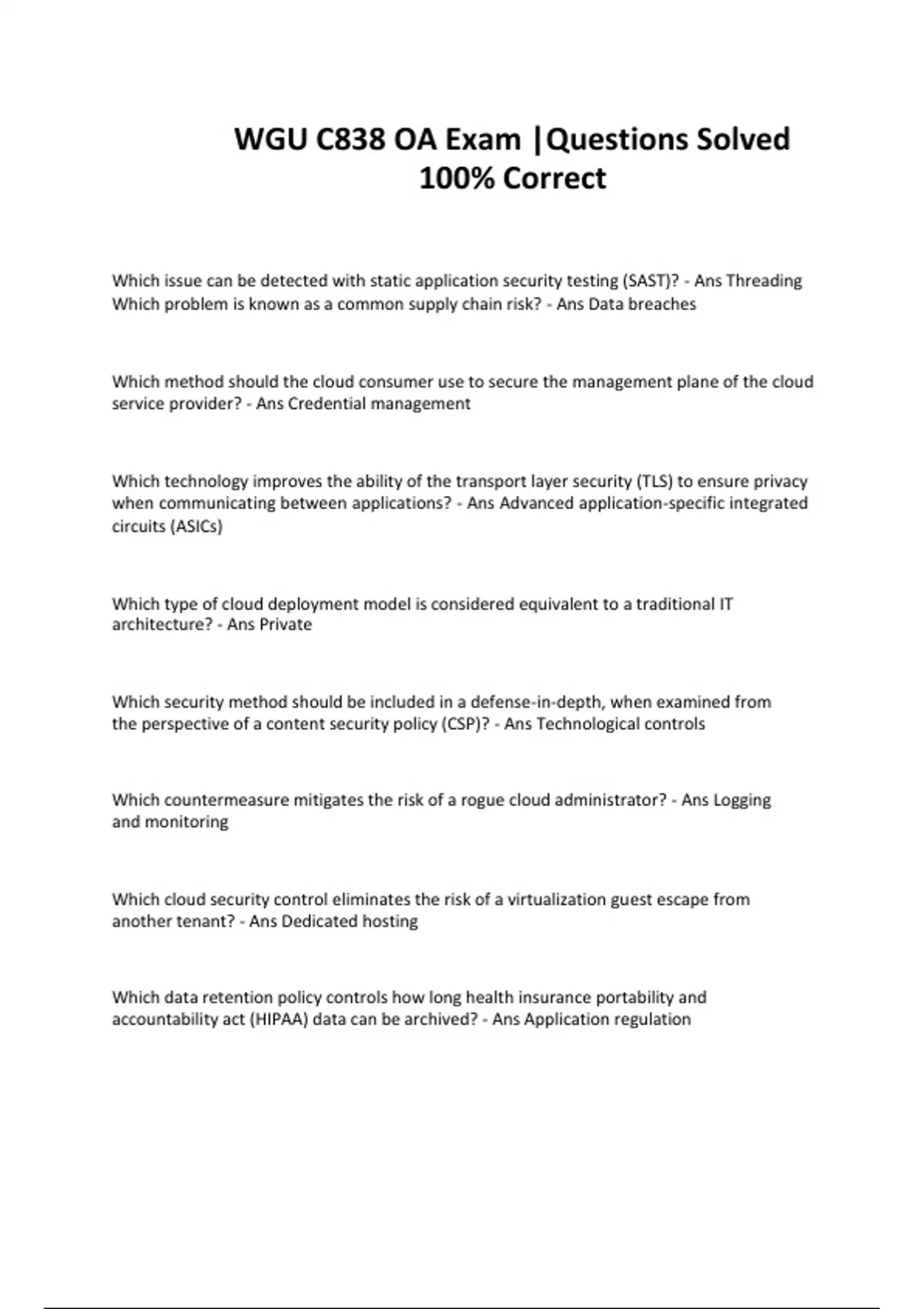 Which issue can be detected with static application security testing (SAST)? - Ans Threading Which problem is known as a common supply chain risk? - Ans Data breaches Which method should the cloud consumer use to secure the management plane of the cloud service provider? - Ans Credential management Which technology improves the ability of the transport layer security (TLS) to ensure privacy when communicating between applications? - Ans Advanced application-specific integrated circuits (ASICs)