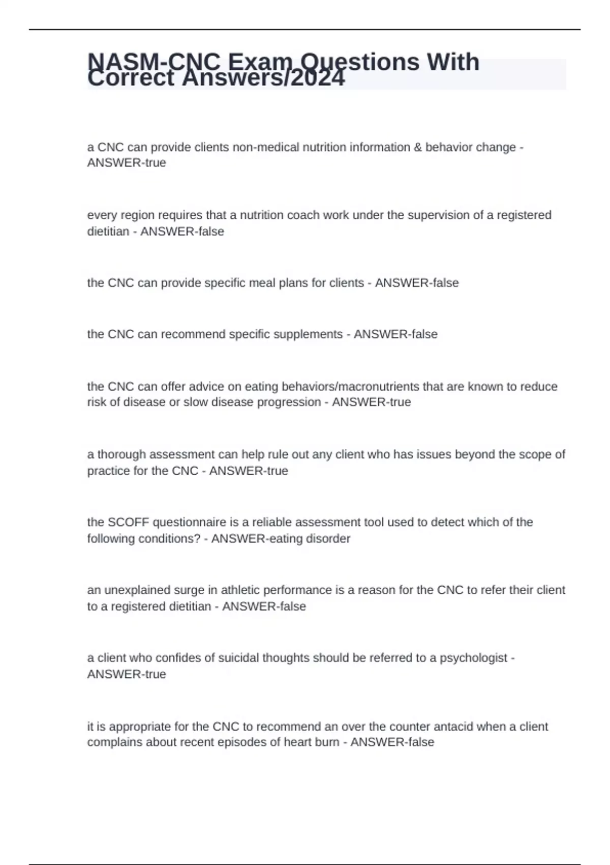 a CNC can provide clients non-medical nutrition information & behavior change - ANSWER-true every region requires that a nutrition coach work under the supervision of a registered dietitian - ANSWER-false the CNC can provide specific meal plans for clients - ANSWER-false the CNC can recommend specific supplements - ANSWER-false the CNC can offer advice on eating behaviors/macronutrients that are known to reduce risk of disease or slow disease progression - ANSWER-true a thorough assessment can help rule out any client who has issues beyond the scope of practice for the CNC - ANSWER-true the SCOFF questionnaire is a reliable assessment tool used to detect which of the following conditions? - ANSWER-eating disorder an unexplained surge in athletic performance is a reason for the CNC to refer their client to a registered dietitian - ANSWER-false a client who confides of suicidal thoughts should be referred to a psychologist - ANSWER-true it is appropriate for the CNC to recommend an over the counter antacid when a client complains about recent episodes of heart burn - ANSWER-false when it comes to client confidentiality, all personal information should be kept in a locked/secure area - ANSWER-true if the CNC intends to work as an employee in a private health club, its important to consult with an attorney & accountant to ensure proper business practices - ANSWER-true when working with a client who has been complaining of low back pain that has been getting worse, what is the most appropriate recommendation - ANSWER-refer to a chiropractor common assessments performed by a CNC include height, weight, body composition & what other test? - ANSWER-anthropometric measurements