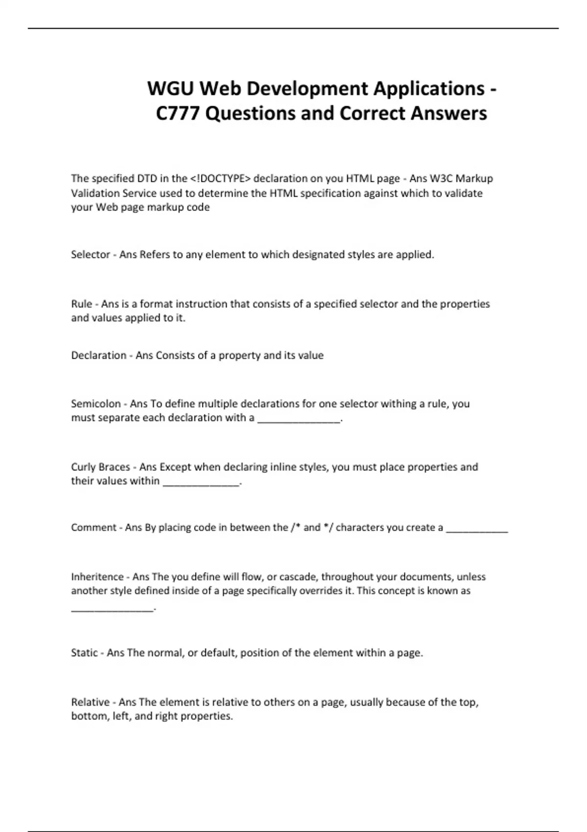 The specified DTD in the <!DOCTYPE> declaration on you HTML page - Ans W3C Markup Validation Service used to determine the HTML specification against which to validate your Web page markup code Selector - Ans Refers to any element to which designated styles are applied. Rule - Ans is a format instruction that consists of a specified selector and the properties and values applied to it