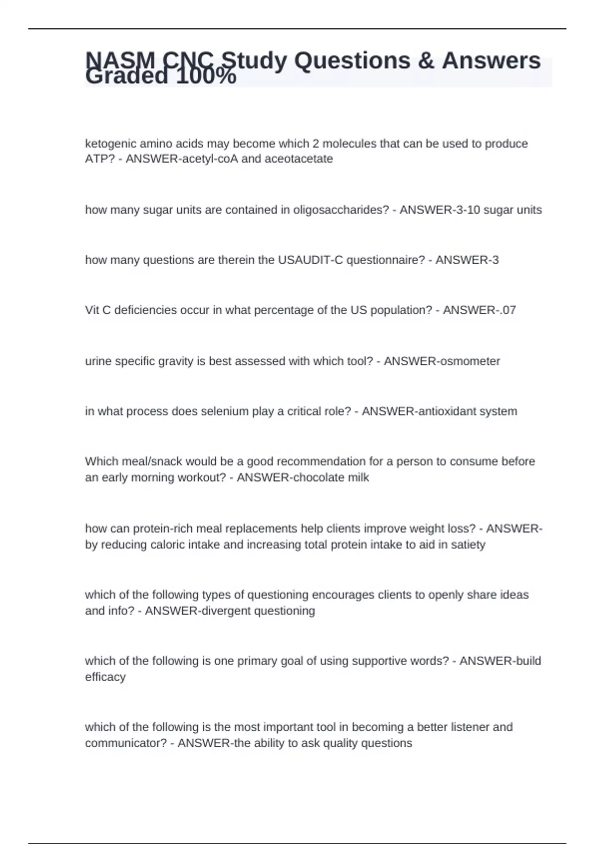 ketogenic amino acids may become which 2 molecules that can be used to produce ATP? - ANSWER-acetyl-coA and aceotacetate how many sugar units are contained in oligosaccharides? - ANSWER-3-10 sugar units how many questions are therein the USAUDIT-C questionnaire? - ANSWER-3 Vit C deficiencies occur in what percentage of the US population? - ANSWER-.07 urine specific gravity is best assessed with which tool? - ANSWER-osmometer in what process does selenium play a critical role? - ANSWER-antioxidant system Which meal/snack would be a good recommendation for a person to consume before an early morning workout? - ANSWER-chocolate milk how can protein-rich meal replacements help clients improve weight loss? - ANSWER-by reducing caloric intake and increasing total protein intake to aid in satiety which of the following types of questioning encourages clients to openly share ideas and info? - ANSWER-divergent questioning which of the following is one primary goal of using supportive words? - ANSWER-build efficacy which of the following is the most important tool in becoming a better listener and communicator? - ANSWER-the ability to ask quality questions based on the national food survey called What We Eat in America, about 75% of the US population has an eating pattern that is low in which of the following? - ANSWER-fruits the average daily nutrient intake level estimated to meet the requirement of half the healthy individuals in a particular life stage and gender group is known as which of the following? - ANSWER-Estimated average requirement (EAR) which of the following is an appropriate visual approximation for veggies at a meal for an average female adult who requires calories per day? - ANSWER-a baseball To ensure the client is retaining any shared information, it is important that the content presented is perceived to be important and what other quality? - ANSWER-based on prior experience A scientist proposes that sugar is inherently fattening, independent of its calorie content. If that proposal is true, then that would mean that high sugar diets should increase fat gain independent of their calorie content. What term describes this potential consequence? - ANSWER-prediction Which term refers to a proposed explanation for a set of observations? - ANSWER-hypothesis Scientists perform a study looking at the effects of caffeine on vertical jump performance. On one day, they give all the subjects caffeine followed by vertical jump tests. Two weeks later, they give all the subjects a placebo followed by the same vertical jump tests. Which term best describes this study design - ANSWER-crossover Which of the following is best described as the state of being in good health, especially as an actively pursued goal? - ANSWER-wellness