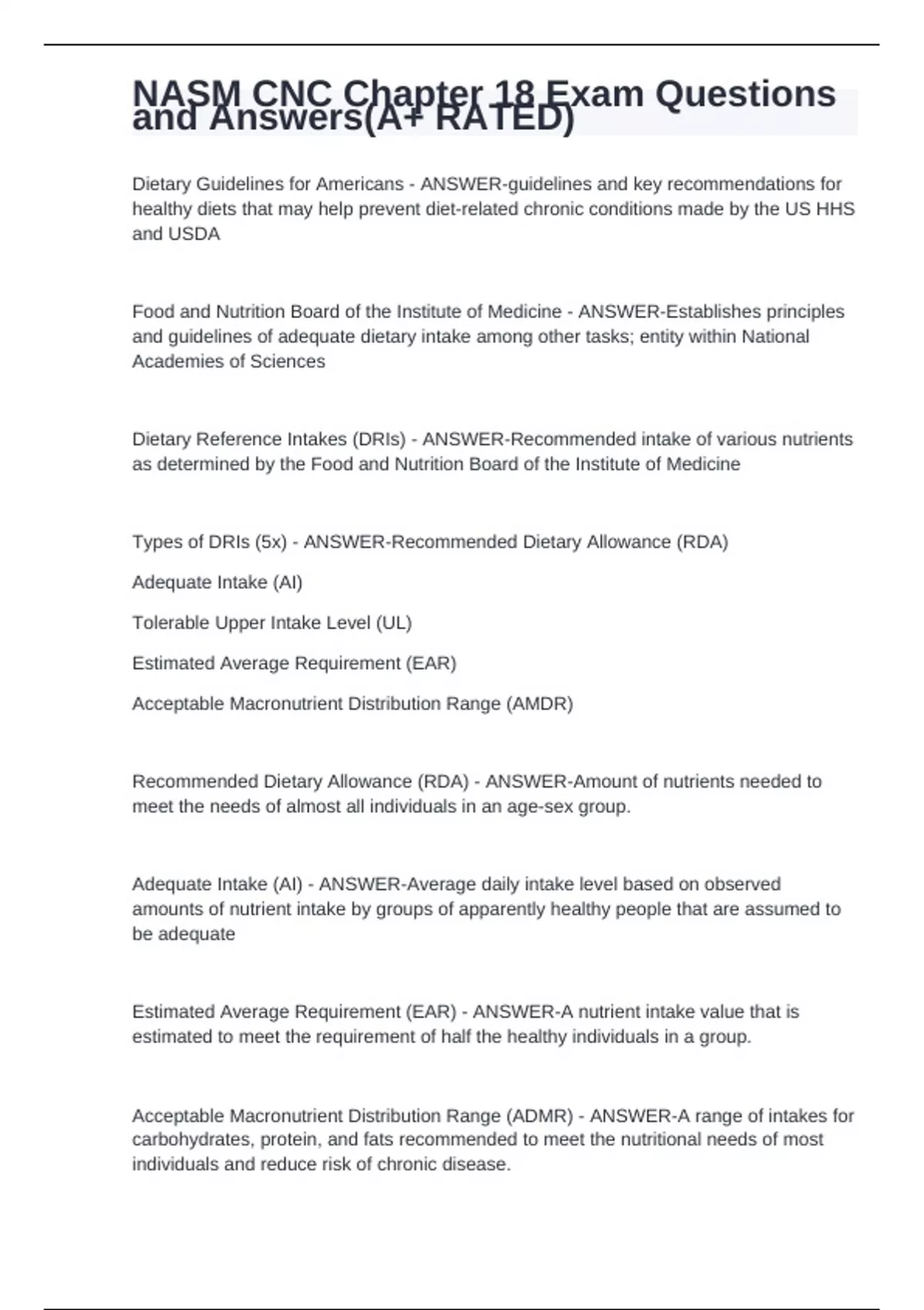 Dietary Guidelines for Americans - ANSWER-guidelines and key recommendations for healthy diets that may help prevent diet-related chronic conditions made by the US HHS and USDA Food and Nutrition Board of the Institute of Medicine - ANSWER-Establishes principles and guidelines of adequate dietary intake among other tasks; entity within National Academies of Sciences Dietary Reference Intakes (DRIs) - ANSWER-Recommended intake of various nutrients as determined by the Food and Nutrition Board of the Institute of Medicine Types of DRIs (5x) - ANSWER-Recommended Dietary Allowance (RDA) Adequate Intake (AI) Tolerable Upper Intake Level (UL) Estimated Average Requirement (EAR) Acceptable Macronutrient Distribution Range (AMDR) Recommended Dietary Allowance (RDA) - ANSWER-Amount of nutrients needed to meet the needs of almost all individuals in an age-sex group. Adequate Intake (AI) - ANSWER-Average daily intake level based on observed amounts of nutrient intake by groups of apparently healthy people that are assumed to be adequate Estimated Average Requirement (EAR) - ANSWER-A nutrient intake value that is estimated to meet the requirement of half the healthy individuals in a group. Acceptable Macronutrient Distribution Range (ADMR) - ANSWER-A range of intakes for carbohydrates, protein, and fats recommended to meet the nutritional needs of most individuals and reduce risk of chronic disease. NIH stands for - ANSWER-National Institutes of Health UL stands for - ANSWER-Tolerable Upper Intake Level EAR stands for - ANSWER-Estimated Average Requirement AMDR stands for - ANSWER-Acceptable Macronutrient Distribution Range RDA stands for - ANSWER-Recommended Dietary Allowance AI stands for - ANSWER-Adequate Intake HHS stands for - ANSWER-Health and Human Services USDA stands for - ANSWER-United States Department of Agriculture