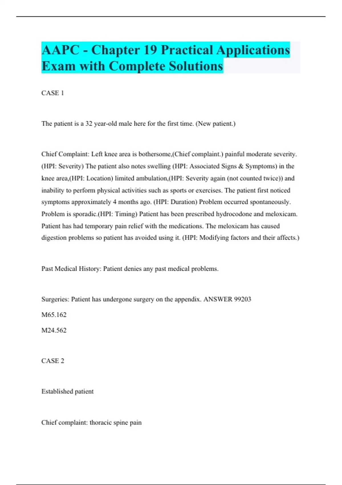 AAPC - Chapter 19 Practical Applications Exam with Complete Solutions CASE 1 The patient is a 32 year-old male here for the first time. (New patient.) Chief Complaint: Left knee area is bothersome,(Chief complaint.) painful moderate severity.(HPI: Severity) The patient also notes swelling (HPI: Associated Signs & Symptoms) in the knee area,(HPI: Location) limited ambulation,(HPI: Severity again (not counted twice)) and inability to perform physical activities such as sports or exercises. The patient first noticed symptoms approximately 4 months ago. (HPI: Duration) Problem occurred spontaneously. Problem is sporadic.(HPI: Timing) Patient has been prescribed hydrocodone and meloxicam. Patient has had temporary pain relief with the medications. The meloxicam has caused digestion problems so patient has avoided using it. (HPI: Modifying factors and their affects.) Past Medical History: Patient denies any past medical problems. Surgeries: Patient has undergone surgery on the appendix. ANSWER 99203 M65.162 M24.562 CASE 2 Established patient Chief complaint: thoracic spine pain
