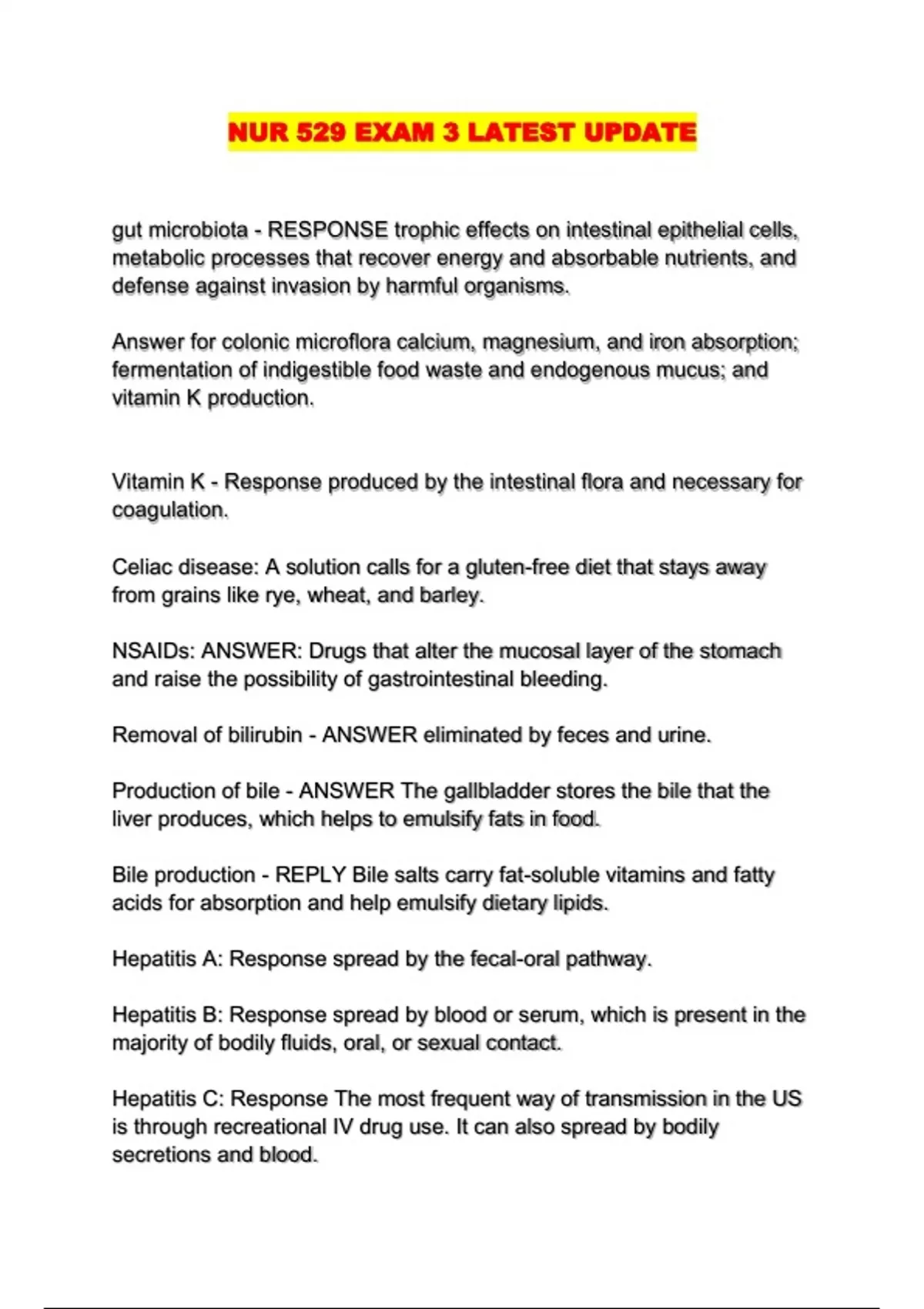 NUR 529 EXAM 3 LATEST UPDATE gut microbiota - RESPONSE trophic effects on intestinal epithelial cells, metabolic processes that recover energy and absorbable nutrients, and defense against invasion by harmful organisms. Answer for colonic microflora calcium, magnesium, and iron absorption; fermentation of indigestible food waste and endogenous mucus; and vitamin K production. Vitamin K - Response produced by the intestinal flora and necessary for coagulation. Celiac disease: A solution calls for a gluten-free diet that stays away from grains like rye, wheat, and barley. NSAIDs: ANSWER: Drugs that alter the mucosal layer of the stomach and raise the possibility of gastrointestinal bleeding. Removal of bilirubin - ANSWER eliminated by feces and urine. Production of bile - ANSWER The gallbladder stores the bile that the liver produces, which helps to emulsify fats in food. Bile production - REPLY Bile salts carry fat-soluble vitamins and fatty acids for absorption and help emulsify dietary lipids. Hepatitis A: Response spread by the fecal-oral pathway. Hepatitis B: Response spread by blood or serum, which is present in the majority of bodily fluids, oral, or sexual contact. Hepatitis C: Response The most frequent way of transmission in the US is through recreational IV drug use. It can also spread by bodily secretions and blood. Malnutrition diagnostic lab tests include serum electrolytes, albumin, prealbumin, ANSWER CMP, and physical examination. Fat tissue - Response An endocrine organ that regulates hunger and energy storage by secreting adipokines, such as leptin. Leptin - RESPONSE hormone released by adipose tissue that controls hunger and alerts the brain when the body has stored enough calories. The anterior pituitary gland (FLAT PiG mnemonic) and posterior pituitary gland (vasopressin, oxytocin) produce hypothalamic hormones, or ANSWER hormones. Diabetes Type 1: ANSWER Etiology: The pancreatic B-cells' incapacity to generate insulin. Polydipsia, polyphagia, and polyuria are diagnostic criteria. Diabetes Type 2: ANSWER Variations from Type 1 include obesity, insulin resistance, and lifestyle-related issues. Risk of complications and persistent hyperglycemia are similarities. DKA - REPLY Clinical signs include weariness, nausea, vomiting, polyuria, polydipsia, Kussmaul's respirations, and a fruity breath odor. Answer for Cushing syndrome Clinical features include a bulging abdomen, moon face, subclavicular fat pads, weak muscles, slender limbs, and psychological problems. State of hyperosmolar hyperglycemia - Response brought on by a lack of insulin, extreme dehydration, and elevated blood sugar. has an impact on fluid balance and raises the risk of thromboembolism. Diabetes's microvascular complications: ANSWER Nephropathy, neuropathy, and retinal damage. Adrenal gland hormones: A response Mineralocorticosteroids/aldosterone, cortisol in the adrenal cortex. In the adrenal medulla: adrenaline.