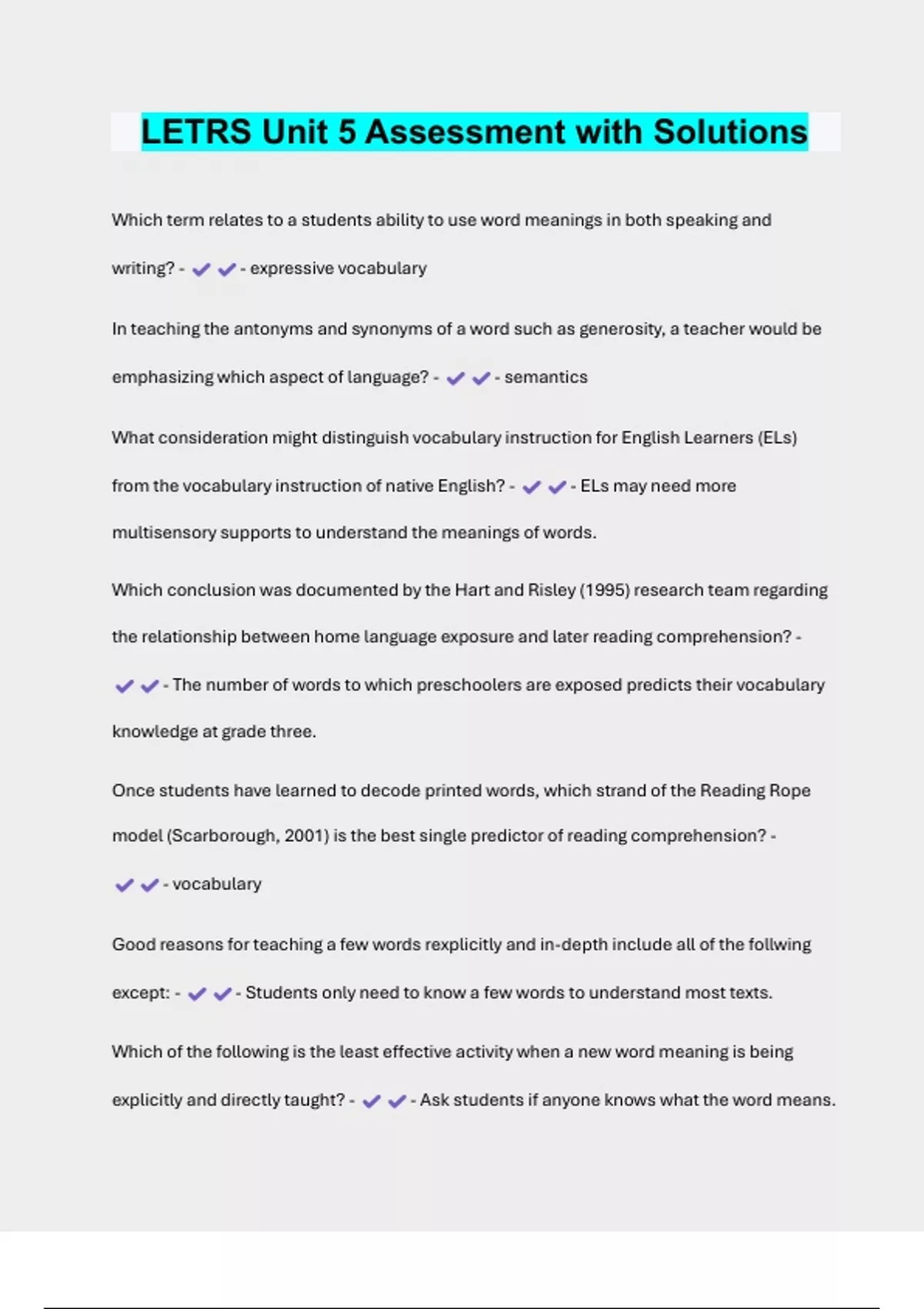 LETRS Unit 5 Assessment with Solutions Which term relates to a students ability to use word meanings in both speaking and writing? - - expressive vocabulary In teaching the antonyms and synonyms of a word such as generosity, a teacher would be emphasizing which aspect of language? - - semantics What consideration might distinguish vocabulary instruction for English Learners (ELs) from the vocabulary instruction of native English? - - ELs may need more multisensory supports to understand the meanings of words. Which conclusion was documented by the Hart and Risley (1995) research team regarding the relationship between home language exposure and later reading comprehension? - - The number of words to which preschoolers are exposed predicts their vocabulary knowledge at grade three. Once students have learned to decode printed words, which strand of the Reading Rope model (Scarborough, 2001) is the best single predictor of reading comprehension? - - vocabulary Good reasons for teaching a few words rexp