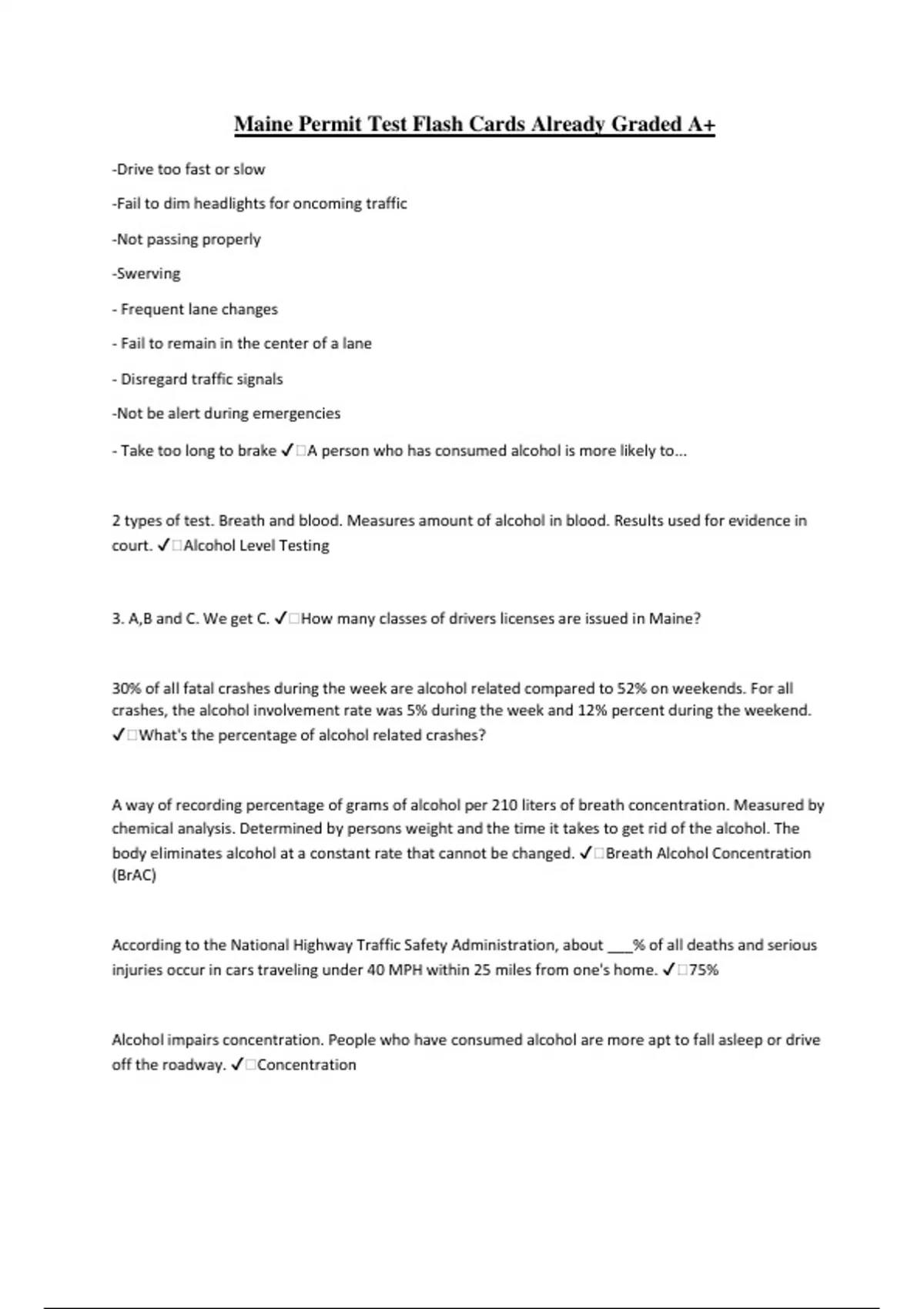 Maine Permit Test Flash Cards Already Graded A+ -Drive too fast or slow -Fail to dim headlights for oncoming traffic -Not passing properly -Swerving - Frequent lane changes - Fail to remain in the center of a lane - Disregard traffic signals -Not be alert during emergencies - Take too long to brake ️A person who has consumed alcohol is more likely to... 2 types of test. Breath and blood. Measures amount of alcohol in blood. Results used for evidence in court. ️Alcohol Level Testing 3. A,B and C. We get C. ️How many classes of drivers licenses are issued in Maine? 30% of all fatal crashes during the week are alcohol related compared to 52% on weekends. For all crashes, the alcohol involvement rate was 5% during the week and 12% percent during the weekend. ️What's the percentage of alcohol related crashes? A way of recording percentage of grams of alcohol per 210 liters of breath concentration. Measured by chemical analysis. Determined by persons weight and the time it takes to get rid of the alcohol. The body eliminates alcohol at a constant rate that cannot be changed. ️Breath Alcohol Concentration (BrAC) According to the National Highway Traffic Safety Administration, about ___% of all deaths and serious injuries occur in cars traveling under 40 MPH within 25 miles from one's home. ️75% Alcohol impairs concentration. People who have consumed alcohol are more apt to fall asleep or drive off the roadway. ️Concentration Alcohol impairs this. It makes your reaction time slower. ️Reaction Time Alcohol impairs this. The more someone drinks, the less coordination they have. ️Coordination Alcohol impairs your alertness. ️Alertness Allergy medicine, cough syrup, etc contain chemicals that can effect driving. ️Over-The-Counter Meds Alluding a cop, Passing a roadblock, Street racing. ️Traffic Violations that automatically get 90 day suspensions Approximately how many people die each year in motor vehicle accidents in the United States? ️40 45,000 people. At 50 MPH, it takes about ____ feet to stop? ️188 feet At a four way stop, who has the right of way? ️The person who stopped first. Automobiles get ___% better mileage at 55 MPH than at 70 MPH. ️20% Before you make a left hand turn you must signal continuously during the last ____ feet before the turn ️100 Can impair driving. Ask doctor about side effects of prescription meds. ️Prescrip