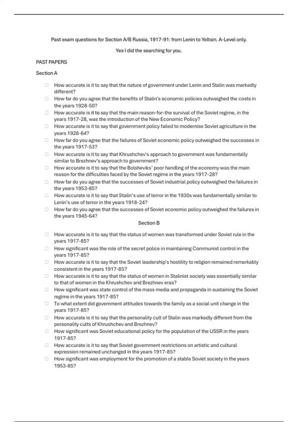 From past papers and the communist book I compiled 89 QUESTIONS to practise. So you don't have to look for them. In a checklist to tick off. Sections A and B only. Covers units 1-4 of Russia 1917-89.