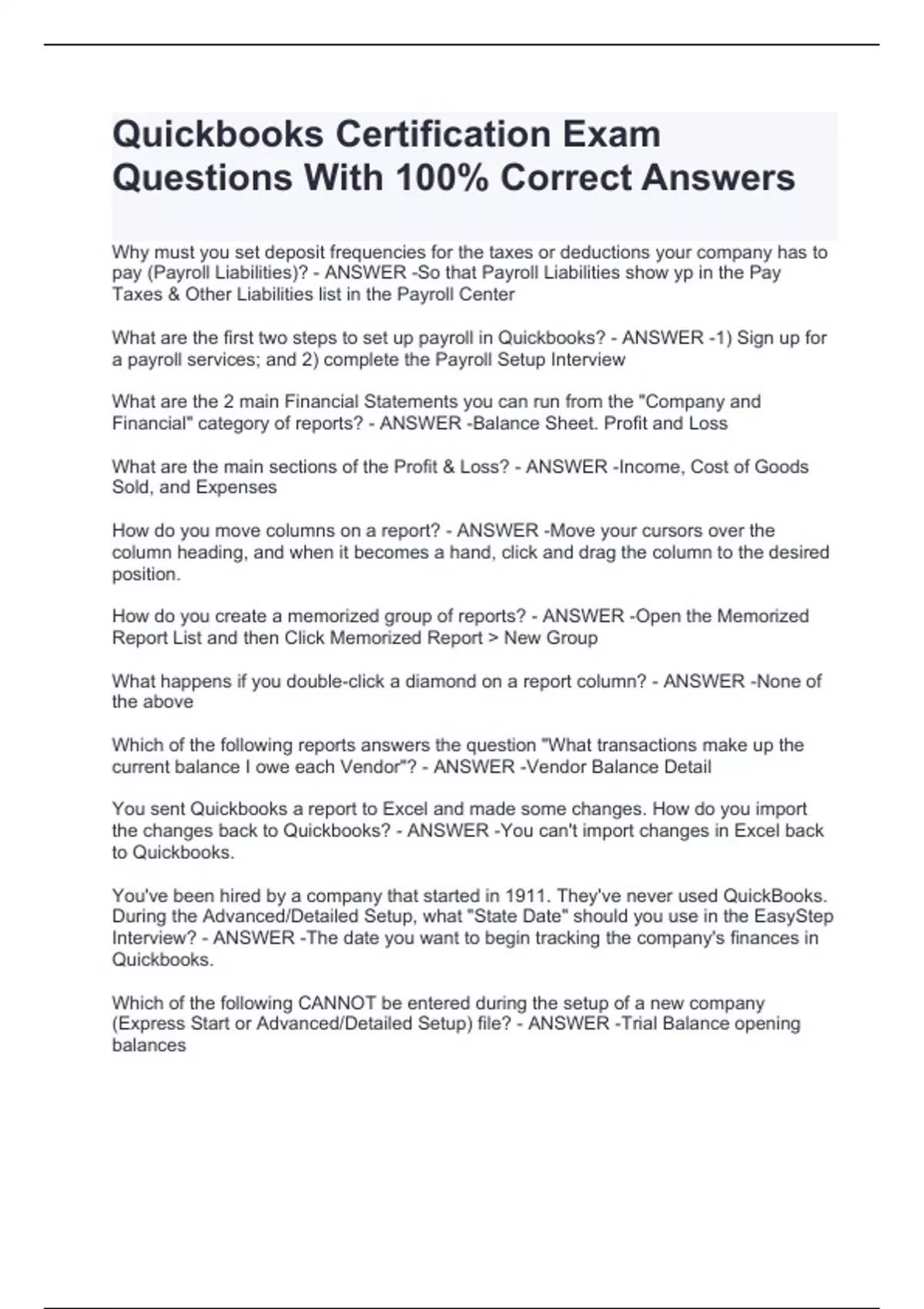 Why must you set deposit frequencies for the taxes or deductions your company has to pay (Payroll Liabilities)? - ANSWER -So that Payroll Liabilities show yp in the Pay Taxes & Other Liabilities list in the Payroll Center What are the first two steps to set up payroll in Quickbooks? - ANSWER -1) Sign up for a payroll services; and 2) complete the Payroll Setup Interview What are the 2 main Financial Statements you can run from the "Company and Financial" category of reports? - ANSWER -Balance Sheet. Profit and Loss What are the main sections of the Profit & Loss? - ANSWER -Income, Cost of Goods Sold, and Expenses How do you move columns on a report? - ANSWER -Move your cursors over the column heading, and when it becomes a hand, click and drag the column to the desired position. How do you create a memorized group of reports? - ANSWER -Open the Memorized Report List and then Click Memorized Report New Group What happens if you double-click a diamond on a report column? - ANSWER -None of the above Which of the following reports answers the question "What transactions make up the current balance I owe each Vendor"? - ANSWER -Vendor Balance Detail You sent Quickbooks a report to Excel and made some changes. How do you import the changes back to Quickbooks? - ANSWER -You can't import changes in Excel back to Quickbooks. You've been hired by a company that started in 1911. They've never used QuickBooks. During the Advanced/Detailed Setup, what "State Date" should you use in the EasyStep Interview? - ANSWER -The date you want to begin tracking the company's finances in Quickbooks. Which of the following CANNOT be entered during the setup of a new company (Express Start or Advanced/Detailed Setup) file? - ANSWER -Trial Balance opening balances How do you customize Quickbooks by changing the color scheme and adding or removing icons from the Home page? - ANSWER -Choose Edit Preferences Desktop View ??? - ANSWER -Click the Formatting Tab at the top of the form; then click Customize Data Layout You need to enter the same transaction each month (for example, an insurance payment). How can you automate this process in Quickbooks? - ANSWER -While the transaction is on the screen, choose Edit Memorize check (or the name of the transaction). How do you set up multiple users in QuickBooks Pro or Premier? - ANSWER -Choose Company Set Up Users and Passwords Set Up Users What is the maximum number of names that cab be included on he Names lists in QuickBooks Pro or Premier? - ANSWER -14,500 What keyboard shortcut allows you to see a total for all four names lists? - ANSWER -F2 What do the diamonds mean on certain lists (for example, the diamonds to the left of each Customer: Job)? - ANSWER -You can click on the diamond and move the list entry to a different location on the list.